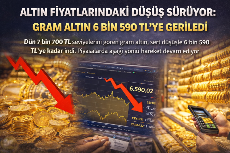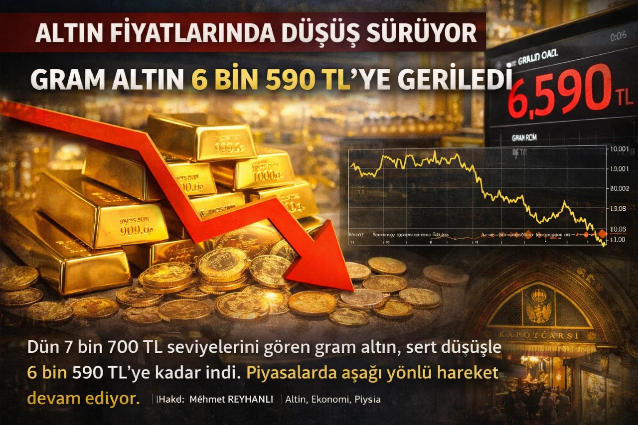 <h3 data-end="215" data-start="77"><strong data-end="215" data-start="77">Dün 7 bin 700 TL seviyelerini gören gram altın, sert düşüşle 6 bin 590 TL’ye kadar indi. Piyasalarda aşağı yönlü hareket devam ediyor.</strong></h3> <div><strong data-end="215" data-start="77"></strong></div> <div data-end="456" data-start="217">Altın fiyatlarında yaşanan hızlı geri çekilme sürüyor. Dün gün içinde 7 bin 700 TL seviyelerine kadar yükselen gram altın, akşam saatlerinde sert düşüş yaşadı. Saat 21.41 itibarıyla gram altın fiyatı 6 bin 590 TL seviyesine kadar geriledi.</div> <div data-end="717" data-start="458">Piyasalarda yaşanan bu düşüşte, rekor seviyelerin ardından gelen yoğun kâr satışlarının etkili olduğu değerlendiriliyor. Kısa sürede yaşanan yüksek fiyat artışı sonrası yatırımcıların satışa yönelmesiyle altın fiyatlarında hızlı bir düzeltme hareketi görüldü.</div> <div data-end="965" data-start="719">Uzmanlar, altın fiyatlarında kısa vadede dalgalı seyrin devam edebileceğine dikkat çekerken, hem küresel piyasalardaki ons altın hareketlerinin hem de döviz kurundaki değişimlerin fiyatlar üzerinde belirleyici olmaya devam edeceğini ifade ediyor.</div> <h5 data-end="1014" data-start="967">Haber: Mehmet REYHANLI<br data-end="992" data-start="989"></h5>