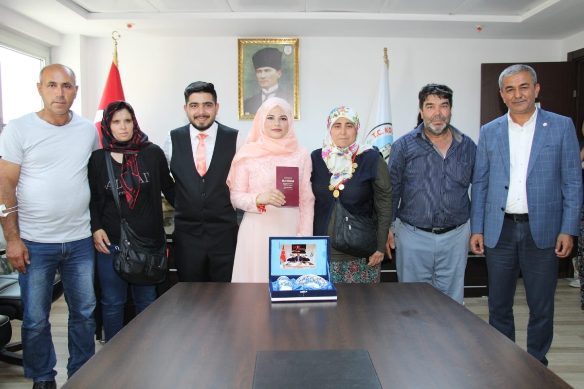 Koçarlı Belediyesi nikah salonu Aydın’da yılın en anlamlı nikah törenine şahitlik yaptı. Geçtiğimiz Mart ayında tanışmalarının ardından kısa sürede anlaşıp evlenme kararı alan konuşma ve işitme engelli genç çiftin nikah töreninde duygulu anlar yaşandı. Aydın’a bağlı Koçarlı’nın Kızılcabölük Mahallesi’nde yaşayan konuşma ve işitme engelli 23 yaşındaki Hasan Hüseyin Emektar ile Mersin’de Gülnar ilçesine bağlı Kuskan Mahallesi’nde yaşayan 19 yaşındaki Emine Kelleli çiftinin nikahını, Koçarlı’da sosyal farkındalık projelerine verdiği destekle bilinen Koçarlı Belediye Başkanı Nedim Kaplan kıydı. Nikah töreninde, geçtiğimiz Mart ayında tanışarak evlenme kararı alan genç çifte hayat yolunda mutluluklar dileyen Başkan Kaplan, sevgiye engel olmadığını vurguladı. Koçarlı Belediyesi nikah salonunda tercüman eşliğinde gerçekleşen nikah töreninde, Damat Hasan Hüseyin Emektar ile Gelin Emine Kelleli’nin annesiyle babasının yanı sıra yeni evli çiftin dostları ve aile yakınları da hazır bulundu. Sosyal medyadan tanışan çifte tercüman aracılığıyla mutluluklar dileyerek tebrik eden Başkan Kaplan, "Kardeşlerimizin işitme ve konuşma ile alakalı bir engel durumu var. Birbirlerini internet üzerinden buluyorlar ve evlenmeye karar veriyorlar. İsteme olayı olmadan her iki gencimiz evlenme kararını verdikten sonra buluşuyorlar. Sonrasında da her iki tarafın ailesi ile birlikte bugün buradayız. Belediyemize yaptıkları müracaat doğrultusunda nikahlarını kıydık. Kızılcabölük, bizim uzak bir mahallemiz. Kuskanda Mersin’in uzak bir mahallesiymiş. Birbirlerini tanıyıp, kaynaşıp, muhabbeti arttırıp bugün evlenmeleri o kadar güzel bir şey ki; engelli olmanın yaşamaya ve birlikte olmaya engel olmadığını bir kez daha gördük” ifadelerini kullandı. Başkan Kaplan nikah kıyma işlemi ve yapılan konuşmaların ardından yeni evli çifte mutluluklar dileyerek fincan takımı hediye etti.
