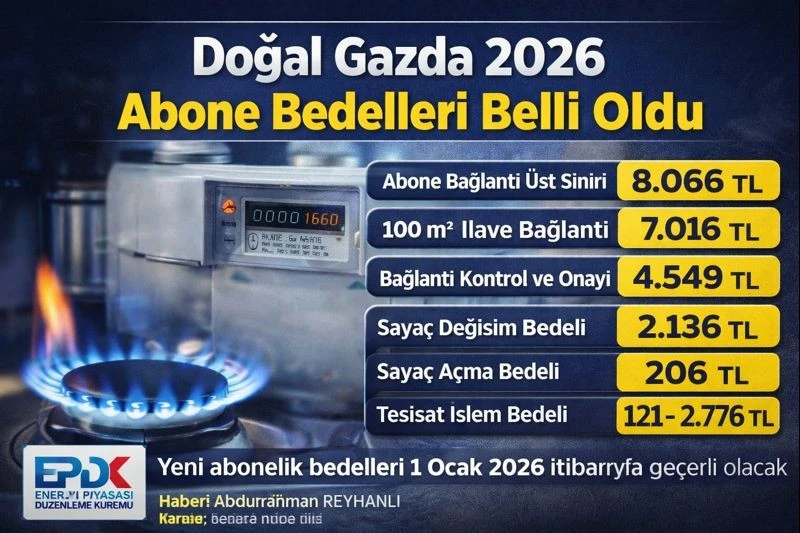<h3 data-end="432" data-start="287">EPDK’nin Resmi Gazete’de yayımlanan kurul kararına göre, doğal gazda 2026 yılı abone bağlantı, sayaç ve tesisat bedelleri yeniden belirlendi.</h3> <div data-end="666" data-start="434">Enerji Piyasası Düzenleme Kurumu (EPDK) tarafından alınan ve Resmi Gazete’nin mükerrer sayısında yayımlanan kurul kararıyla, doğal gaz dağıtım şirketlerinin 2026 yılında uygulayacağı abone bağlantı ve hizmet bedelleri netleşti.</div> <div data-end="666" data-start="434"></div> <div data-end="832" data-start="668">Karara göre, abone bağlantı bedelinde üst sınır 8 bin 66 lira olarak belirlendi.<br data-end="755" data-start="752">İlave abone bağlantı bedeli, 100 metrekare için 7 bin 16 lira olacak.</div> <div data-end="931" data-start="834">Bağlantı kontrol ve onay bedeli ise ilk 100 metre için 4 bin 549 lira olarak uygulanacak.</div> <h3 data-end="963" data-start="933">Sayaç ve Tesisat Bedelleri</h3> <div data-end="1050" data-start="965">EPDK kararında sayaç ve tesisat işlemlerine ilişkin ücretler de açıklandı. Buna göre:</div> <div data-end="1107" data-start="1054">Ön ödemeli sayaç değişim bedeli: 2 bin 136 lira</div> <div data-end="1150" data-start="1110">Sayaç açma-kapama bedeli: 206 lira</div> <div data-end="1228" data-start="1153">İç tesisat işlem bedeli: 121 lira ile 2 bin 776 lira arasında değişecek</div> <div data-end="1306" data-start="1230">Belirlenen tüm bedeller, 1 Ocak 2026 tarihinden itibaren geçerli olacak.</div> <div data-end="1370" data-start="1313">Haber: Abdurrahman REYHANLI<br data-end="1347" data-start="1344">doğal gaz, epdk, enerji</div>