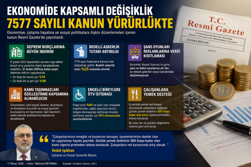 <h3 data-end="200" data-start="65"><strong data-end="200" data-start="65">Deprem borçlarına büyük indirim, bedelli askerlikte artış, çalışanlara yemek desteği… Yeni düzenlemeler Resmi Gazete’de yayımlandı.</strong></h3> <div data-end="672" data-start="202">Ekonomiye, çalışma hayatına ve sosyal politikalara ilişkin çok sayıda düzenlemeyi içeren 7577 sayılı Bazı Kanunlarda Değişiklik Yapılmasına Dair Kanun, Resmi Gazete’de yayımlanarak yürürlüğe girdi. Yeni kanun, özellikle deprem bölgesindeki vatandaşlardan çalışanlara, işverenlerden engelli bireylere kadar geniş bir kesimi doğrudan etkileyen hükümler içeriyor. Düzenlemeler, hem ekonomik yüklerin hafifletilmesini hem de bazı alanlarda yeni denge kurulmasını hedefliyor.</div> <h3 data-end="717" data-start="674" data-section-id="1h3tanq">Deprem borçlarında dikkat çeken indirim</h3> <div data-end="1039" data-start="719">Kanunun en önemli başlıklarından biri, 6 Şubat 2023’te Kahramanmaraş merkezli depremlerin ardından inşa edilen konut ve iş yerlerine ilişkin borçlandırma sistemi oldu. Yeni düzenlemeye göre, bu konut ve iş yerlerinin borçlarını 31 Aralık 2026 tarihine kadar peşin ödeyen vatandaşlara ciddi oranlarda indirim uygulanacak.</div> <div data-end="1408" data-start="1041">Buna göre, en fazla bir konut için yüzde 74, en fazla bir iş yeri için ise yüzde 48 oranında indirim sağlanacak. Bu uygulama, özellikle deprem sonrası yeniden hayat kurmaya çalışan vatandaşlar için önemli bir ekonomik kolaylık olarak öne çıkıyor. Peşin ödeme seçeneğiyle birlikte devlet, vatandaşın borç yükünü azaltmayı ve tahsilat sürecini hızlandırmayı hedefliyor.</div> <h3 data-end="1446" data-start="1410" data-section-id="1hbv74q">Bedelli askerlik ücretinde artış</h3> <div data-end="1744" data-start="1448">Kanun kapsamında Askeralma Kanunu’nda yapılan değişiklikle bedelli askerlik tutarında da artışa gidildi. Yeni düzenlemeye göre bedelli askerlik ücreti yüzde 25 oranında artırıldı. Bu artış, mevcut ekonomik koşullar ve bütçe dengeleri doğrultusunda yapılan bir güncelleme olarak değerlendiriliyor.</div> <div data-end="1971" data-start="1746">Bedelli askerlik sisteminde yapılan bu değişiklik, başvuru yapmayı planlayan vatandaşlar açısından önemli bir mali değişim anlamına geliyor. Yeni tutarın önümüzdeki dönemde başvuru sayılarına nasıl yansıyacağı merak ediliyor.</div> <h3 data-end="2010" data-start="1973" data-section-id="7vl4i3">Şans oyunlarına vergi sınırlaması</h3> <div data-end="2283" data-start="2012">Kurumlar Vergisi Kanunu’nda yapılan değişiklikle birlikte, şans ve bahis oyunlarına ait ilan ve reklam giderlerinin vergi matrahından düşülmesi uygulamasına son verildi. Bu düzenleme ile söz konusu sektörlerde faaliyet gösteren şirketlerin vergi avantajı sınırlandırıldı.</div> <div data-end="2557" data-start="2285">Devlet, bu adımla birlikte hem vergi kayıplarını azaltmayı hem de şans oyunları sektöründe daha kontrollü bir ekonomik yapı oluşturmayı amaçlıyor. Uzmanlar, bu düzenlemenin sektörde faaliyet gösteren şirketlerin mali planlamalarını doğrudan etkileyeceğini değerlendiriyor.</div> <h3 data-end="2594" data-start="2559" data-section-id="51kjip">Kamu taşınmazları için yeni yol</h3> <div data-end="2902" data-start="2596">Kanunla birlikte kamu kurumlarına ait taşınmazlarla ilgili de önemli bir düzenleme getirildi. Üniversiteler, özel bütçeli idareler, düzenleyici ve denetleyici kurumlar ile sosyal güvenlik kuruluşlarının mülkiyetinde bulunan taşınmazlar, ilgili idarelerin talebi halinde özelleştirme kapsamına alınabilecek.</div> <div data-end="3153" data-start="2904">Bu düzenleme, kamu varlıklarının daha etkin değerlendirilmesi ve ekonomiye kazandırılması açısından önemli bir adım olarak görülüyor. Özelleştirme sürecinin nasıl işleyeceği ve hangi taşınmazların kapsama alınacağı ise önümüzdeki süreçte netleşecek.</div> <h3 data-end="3190" data-start="3155" data-section-id="108gsp6">Engelli bireylere ÖTV kolaylığı</h3> <div data-end="3474" data-start="3192">Yeni kanun, engelli bireyler için de dikkat çeken bir düzenleme içeriyor. Engel oranı yüzde 40 ve üzeri olan ortopedik engellilerden, sağlık raporuyla sürücü belgesi alamayacağı belirlenen vatandaşlar, belirli taşıtlar için Özel Tüketim Vergisi (ÖTV) istisnasından yararlanabilecek.</div> <div data-end="3666" data-start="3476">Bu düzenleme, özellikle hareket kabiliyeti kısıtlı bireylerin ulaşım imkanlarını artırmayı hedefliyor. ÖTV istisnasının kapsamı ve uygulanma şekli, ilgili mevzuat doğrultusunda belirlenecek.</div> <h3 data-end="3712" data-start="3668" data-section-id="9bo312">Çalışanlara yemek desteği: 300 TL sınırı</h3> <h3 data-end="3712" data-start="3668" data-section-id="9bo312"></h3> <div data-end="3978" data-start="3714">Kanunun çalışma hayatına ilişkin en önemli başlıklarından biri de yemek ücretleriyle ilgili düzenleme oldu. Buna göre, iş yerinde yemek verilmediği durumlarda çalışanlara sağlanan günlük yemek bedelinin 300 liraya kadar olan kısmı sigorta priminden muaf tutulacak.</div> <div data-end="4267" data-start="3980">Bu uygulama, çalışanların net gelirinde artış sağlayacak. Aynı zamanda işverenler açısından da maliyet avantajı oluşturacak bir düzenleme olarak öne çıkıyor. Belirlenen 300 liralık tutar, her yıl yeniden değerleme oranına göre artırılacak ve küçük kesirler hesaplamaya dahil edilmeyecek.</div> <h3 data-end="4318" data-start="4269" data-section-id="1109h14">Bakan Işıkhan: “Çalışanların kazancı artacak”</h3> <div data-end="4652" data-start="4320">Çalışma ve Sosyal Güvenlik Bakanı Vedat Işıkhan, düzenlemeye ilişkin yaptığı açıklamada, yeni uygulamanın hem çalışanlar hem de