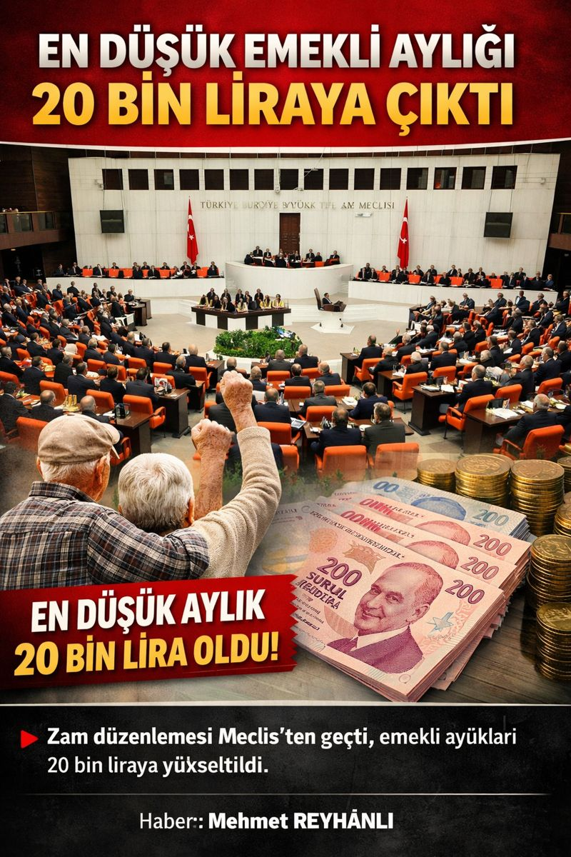 <h3 data-end="184" data-start="49">TBMM’de kabul edilerek yasalaşan düzenlemeyle en düşük emekli aylığı 2026 Ocak ödeme döneminden itibaren 20 bin liraya yükseltildi.</h3> <div data-end="471" data-start="186">En düşük emekli aylığının 20 bin liraya çıkarılmasını da içeren “Bazı Kanunlarda ve 375 Sayılı Kanun Hükmünde Kararnamede (KHK) Değişiklik Yapılmasına Dair Kanun Teklifi”, Türkiye Büyük Millet Meclisi Genel Kurulu’nda kabul edilerek yasalaştı.</div> <div data-end="471" data-start="186"></div> <div data-end="808" data-start="473">Yasayla, Sosyal Sigortalar ve Genel Sağlık Sigortası Kanunu’nda yapılan değişiklik kapsamında; yaşlılık, malullük ve ölüm aylığı alanlar ile hak sahiplerine dosya bazında uygulanan 16 bin 881 liralık asgari ödeme tutarı, 2026 Ocak ayı ödeme döneminden itibaren 20 bin liraya yükseltilecek.</div> <div data-end="972" data-start="810">Düzenleme gereği, kök maaşı bu tutarın altında kalan emeklilerin aylıkları Hazine desteğiyle 20 bin liraya tamamlanacak.</div> <div data-end="1232" data-start="974">Kanunda ayrıca istihdamın artırılması ve kayıtlı istihdamın korunması amacıyla uygulanan asgari ücret işveren desteği de artırıldı. Buna göre destek, 1 Ocak 2026’dan itibaren 1000 liradan 1270 liraya çıkarılacak.</div> <div data-end="1352" data-start="1234">Yasanın yürürlüğe giriş tarihi ve uygulanacak fark ödemeleri, Resmi Gazete’de yayımlanmasının ardından netleşecek.</div> <h5 data-end="1408" data-start="1354">Haber: Mehmet REYHANLI<br data-end="1379" data-start="1376"></h5>