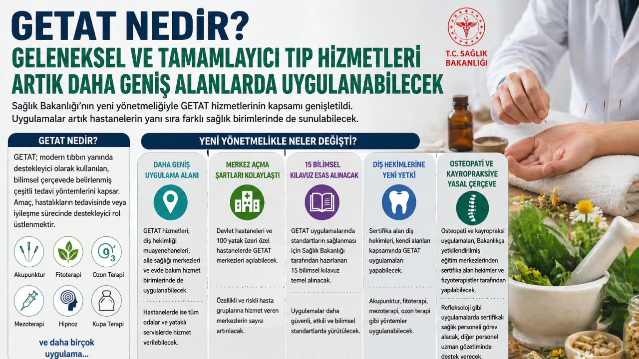 <h3 data-end="482" data-start="206">Sağlık Bakanlığı’nın Resmi Gazete’de yayımladığı yeni yönetmelikle birlikte geleneksel ve tamamlayıcı tıp (GETAT) uygulamalarında kapsamlı değişikliklere gidildi. Yapılan düzenlemeyle bu hizmetlerin kapsamı genişletildi ve farklı sağlık birimlerinde uygulanmasının önü açıldı.</h3> <div data-end="829" data-start="484">GETAT, modern tıbbın yanında destekleyici olarak kullanılan, bilimsel çerçevede belirlenmiş çeşitli tedavi yöntemlerini kapsıyor. Bu yöntemler arasında akupunktur, fitoterapi, ozon tedavisi, mezoterapi, hipnoz ve kupa uygulamaları gibi birçok teknik yer alıyor. Amaç, hastalıkların tedavisinde veya iyileşme sürecinde destekleyici rol üstlenmek.</div> <div data-end="829" data-start="484"></div> <div data-end="873" data-start="831"><strong data-end="873" data-start="831">Artık Daha Geniş Alanlarda Uygulanacak</strong></div> <div data-end="1080" data-start="875">Yeni yönetmelikle birlikte GETAT hizmetleri sadece hastanelerle sınırlı kalmayacak. Diş hekimliği muayenehaneleri, aile sağlığı merkezleri ve evde bakım hizmet birimlerinde de bu uygulamalar yapılabilecek.</div> <div data-end="1279" data-start="1082">Hastanelerde ise GETAT uygulamaları yalnızca belirli odalarda değil, tüm servislerde ve hasta odalarında gerçekleştirilebilecek. Bu değişiklik, hizmetin daha hızlı ve yaygın sunulmasını sağlayacak.</div> <div data-end="1321" data-start="1281"><strong data-end="1321" data-start="1281">Merkez Açma Şartları Kolaylaştırıldı</strong></div> <div data-end="1530" data-start="1323">Düzenleme kapsamında GETAT uygulama ünitesi ve merkezlerinin açılması için gerekli şartlar esnetildi. Devlet hastaneleri ile yüz yatak üzeri özel hastanelerde yeni merkezlerin açılması mümkün hale getirildi.</div> <div data-end="1648" data-start="1532">Bu adım, özellikle kronik hastalar ve özel bakım gerektiren gruplar için hizmete erişimi kolaylaştırmayı hedefliyor.</div> <div data-end="1687" data-start="1650"><strong data-end="1687" data-start="1650">Bilimsel Kılavuzlar Esas Alınacak</strong></div> <div data-end="1909" data-start="1689">GETAT uygulamalarında standartların korunması amacıyla Sağlık Bakanlığı tarafından hazırlanan 15 ayrı bilimsel kılavuz temel alınacak. Bu kılavuzlar, uygulamaların nasıl yapılacağını belirleyen ortak bir çerçeve sunacak.</div> <div data-end="2026" data-start="1911">Haziran 2025’te yayımlanan bu kılavuzlarla birlikte uygulamaların daha güvenli ve kontrollü yürütülmesi sağlanacak.</div> <div data-end="2082" data-start="2028"><strong data-end="2082" data-start="2028">Diş Hekimlerine ve Fizyoterapistlere Yeni Yetkiler</strong></div> <div data-end="2284" data-start="2084">Yeni yönetmelikle birlikte diş hekimleri de sertifika almaları halinde GETAT uygulamaları yapabilecek. Kendi alanlarıyla sınırlı olmak üzere çeşitli tamamlayıcı tedavi yöntemlerini uygulayabilecekler.</div> <div data-end="2468" data-start="2286">Ayrıca osteopati ve kayropraksi gibi manuel terapi yöntemleri, yalnızca yetkilendirilmiş merkezlerden eğitim alan sertifikalı hekimler ve fizyoterapistler tarafından uygulanabilecek.</div> <div data-end="2628" data-start="2470">Refleksoloji gibi bazı uygulamalarda ise sertifikalı sağlık personeli doğrudan görev alacak, yardımcı personeller ise uzman gözetiminde sürece destek verecek.</div> <div data-end="2785" data-start="2630">Yapılan bu düzenleme ile birlikte GETAT hizmetleri daha erişilebilir hale gelirken, uygulamaların bilimsel standartlar çerçevesinde yürütülmesi sağlanacak.</div> <h3 data-end="2809" data-start="2787">Haber: Mehmet REYHANLI</h3> <div data-is-only-node="" data-is-last-node="" data-end="2841" data-start="2811"></div>