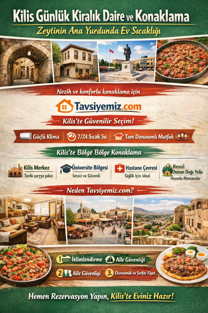 <div>Tarihi İpek Yolu üzerinde, zeytinin anavatanı ve gastronominin gizli başkenti Kilis; daracık tarihi sokakları (kabaltı), taş evleri ve dünyaca ünlü mutfağıyla Güneydoğu'nun butik şehridir. Kilis Tava’nın eşsiz lezzetini tatmak, 7 Aralık Üniversitesi’ni ziyaret etmek veya sınır ticareti için bu sıcak şehre geldiğinizde, konaklama tercihiniz seyahatinizin konforunu belirler. Yazın kavurucu sıcakların hakim olduğu bu coğrafyada, otel odası yerine serin, geniş ve kendi evinizin rahatlığını sunan bir ortam arıyorsanız, <strong>Tavsiyemiz.com</strong> platformu, Kilis’in en nezih <strong>günlük kiralık daire</strong> seçenekleriyle yanınızda yer alır.</div> <div><strong>Cumhuriyet Meydanı ve Üniversite Çevresinde Konforlu Yaşam Alanları</strong></div> <div>Kilis’te yaşam, tarihi Cumhuriyet Meydanı ve çevresindeki çarşılar ile modernleşen üniversite bölgesinde yoğunlaşır. Özellikle yaz aylarında sıcaklıkların yüksek seyretmesi nedeniyle, konaklanacak yerin iklimlendirme (klima) altyapısı ve ferahlığı hayati önem taşır. Bölgedeki profesyonel <strong>Kilis günlükkiralık daireler ve apartlar</strong>, misafirlerine sadece bir anahtar değil; 7/24 sıcak su, güçlü klima sistemleri, tam donanımlı mutfak ve hijyenik yaşam alanları sunar. Biz, Kilis’in misafirperverliğini kurumsal hizmet kalitesiyle birleştiren güvenilir ev sahipleriyle çalışıyoruz.</div> <div></div> <div><strong>Merkezden Oylum Höyük’e: Şehrin Her Noktasında Mola</strong></div> <div>Hizmet ağımız, Kilis’in kalbi olan merkezden tarihi mekanlara yakın lokasyonlara kadar uzanır. Bölgesel ihtiyaçlara göre sunduğumuz çözümler şunlardır:</div> <strong>Kilis Merkez:</strong> Tarihi camilere, Sabah Pazarı’na ve meşhur katmerci dükkanlarına yürüme mesafesinde; iş seyahatleri ve kültür gezileri için ulaşımı en kolay, temiz daireler. <strong>Üniversite Bölgesi (Mehmet Sanlı):</strong> Kilis 7 Aralık Üniversitesi’ne yakın, öğrenci aileleri, akademisyenler veya sınava gelenler için sessiz, güvenli ve modern apart seçenekleri. <strong>Hastane Çevresi:</strong> Sağlık ihtiyaçları veya hasta refakati için şehre gelenlere özel, hastaneye yakın, asansörlü ve hijyen standartları yüksek konaklama birimleri. <strong>Resul Osman Dağı Yolu:</strong> Şehrin gürültüsünden uzaklaşmak ve mesire alanlarına yakın olmak isteyenler için, manzaralı ve havadar aile evleri. <div>İster Ravanda Kalesi'ne çıkın, ister zeytinyağı alışverişi yapın; ihtiyacınız olan konaklama çözümüne sitemizden anında ulaşabilirsiniz.</div> <div><strong>Gastronomi Şehrinde Neden Tavsiyemiz.com’u Tercih Etmelisiniz?</strong></div> <div>Sınırın sıfır noktasındaki bu huzurlu şehirde, Kilis insanının sıcaklığını profesyonel işletmecilikle harmanlayan yerleri sizlerle buluşturuyoruz:</div> <strong>İklimlendirme ve Konfor:</strong> Kilis’in yaz sıcağında mağdur olmamanız için; klimaları bakımlı ve sorunsuz çalışan, kışın ise ısınma problemi yaşatmayan daireleri özenle seçiyoruz. <strong>Aile Hassasiyeti ve Güvenlik:</strong> Sınır şehri olmanın getirdiği hassasiyetle, kimlik bildirim sistemine (KBS) tam uyan, binası güvenli ve ailelerin huzurla kalabileceği noktaları listeliyoruz. <strong>Ekonomik ve Şeffaf Fiyat:</strong> Üniversite kayıt dönemleri veya sınır hareketliliğini fırsata çevirmeyen, yıl boyu bütçe dostu ve şeffaf fiyat politikası izleyen esnafları tercih ediyoruz. <div>Kısacası, <strong>Kilis Tava’nın</strong> lezzetinden <strong>Oylum Höyük’ün</strong> binlerce yıllık tarihine kadar şehrin her noktasında kapınız açık. Hemen rezervasyon yapın, açıkta kalmayın; Tavsiyemiz.com ile eviniz her daim hazır!</div> <h5>HABER MERKEZİ</h5> <div> </div>
