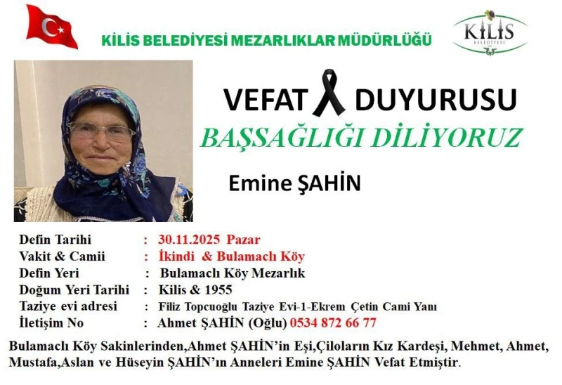 <h3>Kilis’in tanınmış ailelerinden İş insanları Mehmet, Mustafa, Nuri, Hüseyin ve Abdurrahman Yıldırım’ın kız kardeşi olan Emine Şahin, hayatını kaybetti.</h3> <div>Cenaze namazı, bugün ikindi vakti kılınacak ve Bulamaçlı Köyü’nde toprağa verilecek.</div> <div>Kilis halkı ve yakın çevresi, Yıldırım ailesine başsağlığı dileklerinde bulunuyor.</div> <div>Kilis Kent Haber olarak merhumeye Allah’tan rahmet, Yıldırım ailesine başsağlığı dileriz.</div> <div>Haber: İbrahim Güneş</div> <div>Kilis’te Büyük Adım: Binlerce Aile Yeni Yuvasına Kavuştu</div> <div></div> <div> </div>