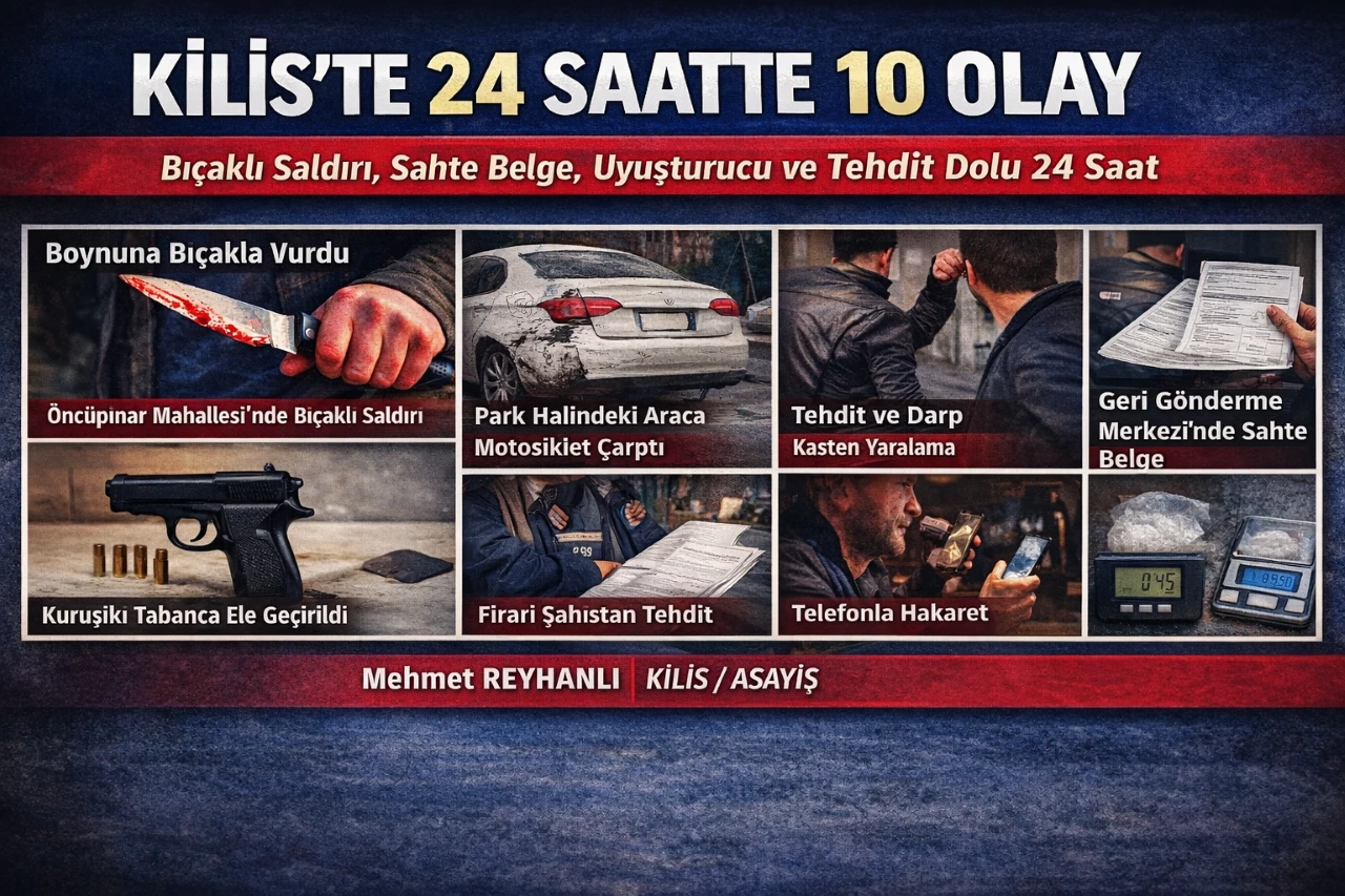 <div data-end="209" data-start="30"><strong data-end="209" data-start="30">Kilis’te polis sorumluluk bölgesinde son 24 saatte mala zarar verme, yaralama, tehdit, resmi belgede sahtecilik, hakaret ve uyuşturucu olmak üzere 6 ayrı olay kayıtlara geçti.</strong></div> <div data-end="415" data-start="211">Kilis İl Emniyet Müdürlüğü sorumluluk bölgesinde 20 Şubat 2026 saat 08.00 ile 21 Şubat 2026 saat 08.00 arasında meydana gelen olaylar açıklandı. Kent genelinde farklı suç başlıklarında adli işlem yapıldı.</div> <h3 data-end="459" data-start="417">Park Halindeki Araca Motosiklet Çarptı</h3> <div data-end="682" data-start="461">18 Şubat saat 19.00 sıralarında meydana gelen olayda 2000 doğumlu M.K., sokak üzerine park ettiği 59 plakalı aracına, 2009 doğumlu suça sürüklenen çocuk M.B.Y.’nin kullandığı 79 plakalı motosikletin çarptığını bildirdi.</div> <div data-end="742" data-start="684">Araçta maddi hasar oluştu. Olayla ilgili işlem başlatıldı.</div> <h3 data-end="770" data-start="744">Darp ve Tehdit İddiası</h3> <div data-end="910" data-start="772">20 Şubat saat 14.00 sıralarında 1965 doğumlu M.O.T., K.A. isimli şahsın kendisini darp ederek tehdit ettiğini belirterek şikâyetçi oldu.</div> <div data-end="948" data-start="912">Olayla ilgili adli süreç başlatıldı.</div> <h3 data-end="979" data-start="950">Husumetli Şahıstan Tehdit</h3> <div data-end="1168" data-start="981">20 Şubat saat 16.40 sıralarında 1983 doğumlu M.D. ve eşi 1988 doğumlu Ç.D., aralarında husumet bulunan 1979 doğumlu A.D.’nin kendilerini tehdit ettiğini beyan ederek müracaatta bulundu.</div> <div data-end="1205" data-start="1170">Şüphelinin firar olduğu bildirildi.</div> <h3 data-end="1247" data-start="1207">Geri Gönderme Merkezinde Sahte Belge</h3> <div data-end="1426" data-start="1249">20 Şubat saat 13.30 sıralarında Kilis Öncüpınar Gönüllü Geri Gönderme Merkezi’ne giden 1994 doğumlu İ.A.M.’nin görevlilere sunduğu muvafakatnamenin sahte olduğu tespit edildi.</div> <div data-end="1495" data-start="1428">Şüpheli hakkında “resmi belgede sahtecilik” suçundan işlem yapıldı.</div> <h3 data-end="1518" data-start="1497">Telefonla Hakaret</h3> <div data-end="1672" data-start="1520">19 Şubat saat 23.50 sıralarında 1970 doğumlu E.S., 1980 doğumlu M.P.’nin kendisini telefonla arayarak hakarette bulunduğunu belirterek şikâyetçi oldu.</div> <div data-end="1710" data-start="1674">Olayla ilgili adli işlem başlatıldı.</div> <h3 data-end="1751" data-start="1712">Narkotikten Metamfetamin Operasyonu</h3> <div data-end="1946" data-start="1753">21 Şubat saat 02.40 sıralarında Narkotik Suçlarla Mücadele Şube Müdürlüğü ekiplerince yapılan kontrollerde 1986 doğumlu S.G.’nin üzerinde daralı ağırlığı 0,45 gram metamfetamin ele geçirildi.</div> <div data-end="1998" data-start="1948">Şüpheli hakkında TCK 191 kapsamında işlem yapıldı.</div> <div data-end="2062" data-start="2000">Kilis’te meydana gelen olaylarla ilgili soruşturmalar sürüyor.</div> <h5 data-end="2111" data-start="2064">Haber: Mehmet REYHANLI<br data-end="2089" data-start="2086"></h5>