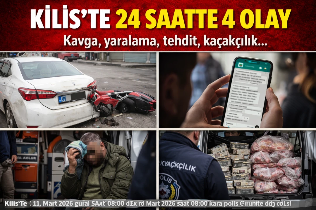 <h3 data-end="176" data-start="30"><strong data-end="176" data-start="30">Kilis’te son 24 saatte meydana gelen olaylarda trafik kazası, tehdit ve hakaret şikayeti, aile içi kavga ile kaçakçılık olayı kayıtlara geçti.</strong></h3> <div data-end="445" data-start="178">Kilis’te 11 Mart 2026 saat 08.00 ile 12 Mart 2026 saat 08.00 arasında polis sorumluluk bölgesinde çeşitli olaylar meydana geldi. Gün içerisinde trafik kazasından aile içi kavgaya, tehdit şikayetlerinden kaçakçılık olayına kadar dört ayrı olay polis kayıtlarına geçti.</div> <h3 data-end="477" data-start="447" data-section-id="1rdvt45">Motosiklete arkadan çarptı</h3> <div data-end="789" data-start="479">Sabah saat 08.30 sıralarında meydana gelen trafik kazasında, 1998 doğumlu F.İ. yönetimindeki 07 plakalı araç aynı yönde seyreden 2000 doğumlu A.K.’nin kullandığı 79 plakalı motosiklete arkadan çarptı. Çarpmanın etkisiyle motosiklet sürücüsü yaralandı. Yaralı A.K.’nin hayati tehlikesinin bulunmadığı öğrenildi.</div> <h3 data-end="831" data-start="791" data-section-id="u29xw4">WhatsApp üzerinden tehdit ve hakaret</h3> <div data-end="1093" data-start="833">Saat 17.40 sıralarında meydana gelen olayda 1999 doğumlu L.Ç., kayınbabası M.Ç. (1972) ve kaynanası G.Ç.’nin (1981) WhatsApp üzerinden ses kaydı göndererek kendisine tehdit ve hakarette bulunduğunu belirterek polise başvurdu. Olayla ilgili inceleme başlatıldı.</div> <h3 data-end="1126" data-start="1095" data-section-id="16seeht">Eşini darp edip tehdit etti</h3> <div data-end="1351" data-start="1128">Necmettin Erbakan Mahallesi’nde saat 17.00 sıralarında yaşanan olayda 1999 doğumlu F.Z.B., eşi 1994 doğumlu R.B.’nin kendisini darp ettiğini ve tehditte bulunduğunu belirterek şikayetçi oldu. Olayla ilgili işlem başlatıldı.</div> <h3 data-end="1396" data-start="1353" data-section-id="ttd6xi">Araçta kaçak sigara ve et ele geçirildi</h3> <div data-end="1631" data-start="1398">Kaçakçılık ve Organize Suçlarla Mücadele Şube Müdürlüğü ekiplerinin çalışmasında 1969 doğumlu A.Y.’nin kullandığı 34 plakalı araçta arama yapıldı. Aramada 190 paket gümrük kaçağı sigara ile 30 kilogram gümrük kaçağı et ele geçirildi.</div> <h5 data-end="1631" data-start="1398">Haber: Mehmet REYHANLI<br data-end="1676" data-start="1673"></h5>