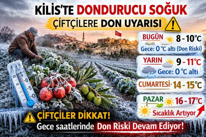 <h3 data-end="200" data-start="56"><strong data-end="200" data-start="56">Kilis’te etkili olan dondurucu soğuk nedeniyle çiftçilere zirai don uyarısı yapıldı. Gece sıcaklıklarının sıfırın altına düşmesi bekleniyor.</strong></h3> <div><strong data-end="200" data-start="56"></strong></div> <div data-end="460" data-start="202">Kilis’te hava sıcaklıkları sert şekilde düştü. Kent genelinde özellikle sabah ve gece saatlerinde hissedilen soğuk hava, tarım alanlarında don riskini gündeme getirdi. Meteorolojik değerlendirmelere göre gece sıcaklıklarının sıfırın altına inmesi bekleniyor.</div> <div data-end="782" data-start="462">Kentte şu anda dondurucu bir soğuk hakim. Gün içerisinde sıcaklıkların 8-10 derece civarında seyretmesi beklenirken, gece saatlerinde termometrelerin 0 derecenin altına düşeceği tahmin ediliyor. Bu durumun özellikle zeytinlikler, sebze ekili alanlar ve erken çiçek açan meyve ağaçları için risk oluşturduğu belirtiliyor.</div> <div data-end="1036" data-start="784">Yarın da benzer hava koşullarının devam etmesi bekleniyor. Gündüz sıcaklığının 9-11 derece civarında olacağı, gece ise don riskinin süreceği bildiriliyor. Yetkililer, çiftçilerin ürünlerini korumak için gerekli tedbirleri alması gerektiğini vurguluyor.</div> <div data-end="1281" data-start="1038">Hafta sonuna doğru ise sıcaklıklarda kademeli artış bekleniyor. Cumartesi günü gündüz sıcaklığının 14-15 dereceye, pazar günü ise 16-17 dereceye kadar yükselmesi öngörülüyor. Ancak gece saatlerinde soğuk hava etkisini bir süre daha sürdürecek.</div> <div data-end="1406" data-start="1283">Tarım kenti olan Kilis’te üreticiler, özellikle gece saatlerinde oluşabilecek don olayına karşı dikkatli olmaya çağrıldı.</div> <h5 data-end="1462" data-start="1408">Haber: Mehmet REYHANLI<br data-end="1433" data-start="1430">Kilis, Hava Durumu, Zirai Don</h5>