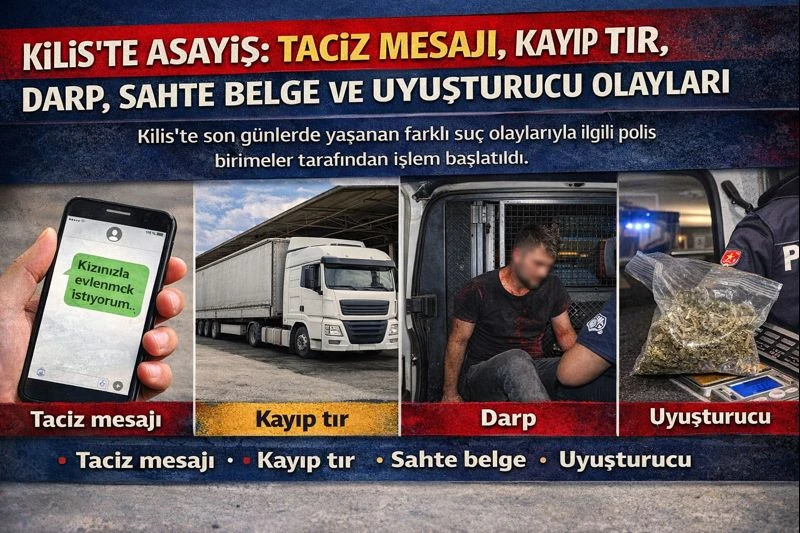 <h3 data-end="86" data-start="0"><strong data-end="86" data-start="0">Kilis’te asayiş: Taciz mesajı, kayıp tır, darp, sahte belge ve uyuşturucu olayları</strong></h3> <h3 data-end="196" data-start="88"><strong data-end="196" data-start="88">Kilis’te son günlerde yaşanan farklı suç olaylarıyla ilgili polis birimleri tarafından işlem başlatıldı.</strong></h3> <div data-end="352" data-start="198">KİLİS – Kilis’te farklı tarihlerde meydana gelen asayiş olaylarıyla ilgili emniyet birimlerine yapılan müracaatlar doğrultusunda adli süreçler başlatıldı.</div> <div data-end="682" data-start="354">06 Ocak 2026 günü saat 12.00 sıralarında, 2004 doğumlu Y.D. isimli müşteki, tanımadığı bir numaradan tanımadığı bir kişinin babasına mesaj atarak “kızınızla evlenmek istiyorum” şeklinde ifadeler kullanması nedeniyle rahatsız edildiğini belirterek şikâyetçi oldu. Olay “kişilerin huzur ve sükûnunu bozma” kapsamında kayda alındı.</div> <div data-end="1001" data-start="684">Aynı gün saat 18.00’de, 1988 doğumlu A.Ö.D. isimli müşteki, nakliye şirketinde işe aldığı 1980 doğumlu T.Ç. isimli şahsı 79 plakalı tırıyla yük almak üzere İzmir’e gönderdiğini, ancak daha sonra kendisine ulaşamadığını beyan ederek müracaatta bulundu. Olayla ilgili “güveni kötüye kullanma” suçundan işlem başlatıldı.</div> <div data-end="1279" data-start="1003">05 Ocak 2026 günü saat 09.30’da ise 2001 doğumlu M.A. isimli müşteki, eski eşi 1991 doğumlu K.M.G. tarafından darp edildiğini, hakarete ve tehdide maruz kaldığını belirterek şikâyetçi oldu. Olayla ilgili “hakaret, tehdit ve kasten yaralama” suçlarından soruşturma yürütülüyor.</div> <div data-end="1540" data-start="1281">07 Ocak 2025 günü saat 16.30’da Kilis Öncüpınar Gönüllü Geri Gönderme Merkezi’ne giden 2001 doğumlu E.H. isimli şahsın görevlilere sunduğu muvafakatnamenin sahte olduğu tespit edildi. Şüpheli hakkında “resmi belgede sahtecilik” suçundan adli işlem başlatıldı.</div> <div data-end="1778" data-start="1542">06 Ocak 2026 günü saat 20.45’te Narkotik Suçlarla Mücadele Şube Müdürlüğü ekiplerince yapılan çalışmada, 2000 doğumlu R.D. isimli şüphelinin üzerinde 1,11 gram esrar maddesi ele geçirildi. Olayla ilgili TCK 191 kapsamında işlem yapıldı.</div> <h5 data-end="1832" data-start="1780">Haber: Mehmet REYHANLI</h5> <div></div> <div></div> <div></div> <h2>Kilis’te 4 bin 750 paket kaçak sigara ele geçirildi</h2>
