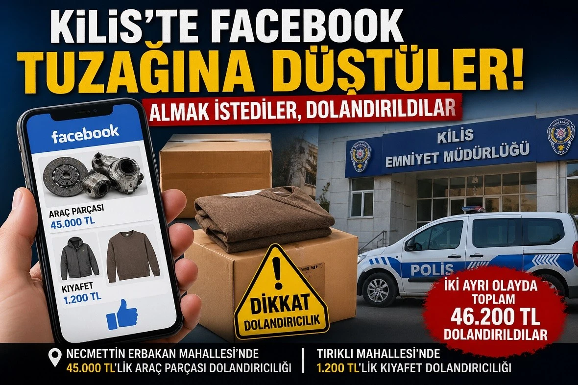 <h3> Farklı mahallelerde yaşanan iki olay sonrası mağdurlar polise başvurdu.</h3> <div data-end="591" data-start="269">Necmettin Erbakan Mahallesi’nde M.M.H. isimli şahıs, Facebook üzerinden araç parçası satın almak için iletişime geçtiği kişiyle 45 bin TL karşılığında anlaşma sağladı. Şüphelinin verdiği IBAN numarasına parayı gönderen vatandaş, karşı tarafın yeniden para talep etmesi üzerine dolandırıldığını anlayarak emniyete başvurdu.</div> <div data-end="1070" data-start="593">Bir diğer olay ise Tırıklı Mahallesi’nde meydana geldi. M.F. isimli şahıs, Facebook üzerinden kıyafet satın almak amacıyla görüştüğü kişiyle 1.200 TL’ye anlaştı. Ürünün kargo ile adresine gelmesi üzerine kapıda ödeme yapan vatandaş, paketi açtığında yanlış kıyafet gönderildiğini fark etti. Satıcıyla yeniden iletişime geçen mağdur, doğru ürünle değiştirilmesi için kıyafeti geri gönderdi. Ancak daha sonra satıcıya ulaşamayınca dolandırıldığını anlayarak polise müracaat etti.</div> <div data-is-only-node="" data-is-last-node="" data-end="1273" data-start="1072">Polis ekipleri her iki olayla ilgili inceleme başlattı. Yetkililer, sosyal medya üzerinden yapılan alışverişlerde güvenilir ve kurumsal satış kanallarının tercih edilmesi konusunda vatandaşları uyardı.</div> <div> Haber: İbrahim Güneş</div> <div>Kilis’te Kuyumculardan Alarm Altın Var, Alıcı Yok! </div>