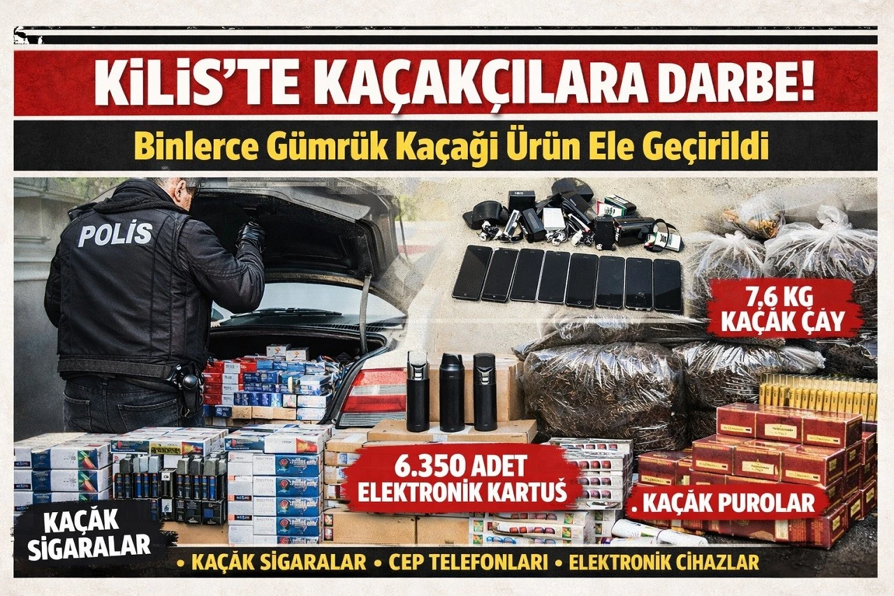 <h3> Kilis’in Mehmet Rıfat Kazancıoğlu Mahallesi’nde polis ekipleri tarafından gerçekleştirilen operasyonda,</h3> <div>M.C., B.K. ve İ.G. isimli şahısların bulunduğu araçta çok sayıda gümrük kaçağı ürün ele geçirildi.</div> <div>Operasyonda, araca gizlenmiş şekilde 330 paket gümrük kaçağı sigara, 10 cep telefonu, 9 cep telefonu şarj cihazı, 2 elektronik sigara, 6.350 elektronik sigara kartuşu, 1.460 puro, 4 saç düzleştirici ve 7,6 kilogram gümrük kaçağı çay bulundu.</div> <div>Polis ekipleri, operasyon kapsamında şüphelileri gözaltına alırken, kaçak ürünlerle ilgili soruşturmanın devam ettiği bildirildi. Yetkililer, vatandaşları kaçak ürün kullanımı ve satışının hem yasal hem de sağlık açısından ciddi riskler içerdiği konusunda uyardı.</div> <div>Haber: İbrahim Güneş</div> <div>Kilis’te Sağanak Felaketi: TOKİ Konutlarını Sel Bastı, Hatay Yolu Kapandı </div> <div> </div>