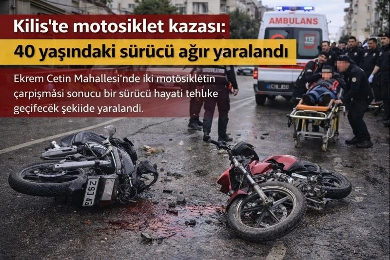 <h3 data-end="187" data-start="68"><strong data-end="187" data-start="68">Ekrem Çetin Mahallesi’nde iki motosikletin çarpışması sonucu bir sürücü hayati tehlike geçirecek şekilde yaralandı.</strong></h3> <div data-end="264" data-start="189">Kilis’te meydana gelen trafik kazasında motosiklet sürücüsü ağır yaralandı.</div> <div data-end="483" data-start="266">Edinilen bilgilere göre, 15 Ocak 2026 günü saat 12.40 sıralarında Ekrem Çetin Mahallesi’nde, 1985 doğumlu A.U. yönetimindeki 79 plakalı motosiklet ile 2009 doğumlu A.Y.Ş.’nin kullandığı 79 plakalı motosiklet çarpıştı.</div> <div data-end="713" data-start="485">Çarpışmanın etkisiyle motosiklet sürücüsü A.U., hayati tehlike arz edecek şekilde yaralandı. İhbar üzerine olay yerine sağlık ekipleri sevk edildi. Yaralı sürücü, yapılan ilk müdahalenin ardından ambulansla hastaneye kaldırıldı.</div> <div data-end="776" data-start="715">Kazayla ilgili polis ekipleri tarafından inceleme başlatıldı.</div> <h5 data-end="835" data-start="778">Haber: Mehmet REYHANLI<br data-end="803" data-start="800"></h5>