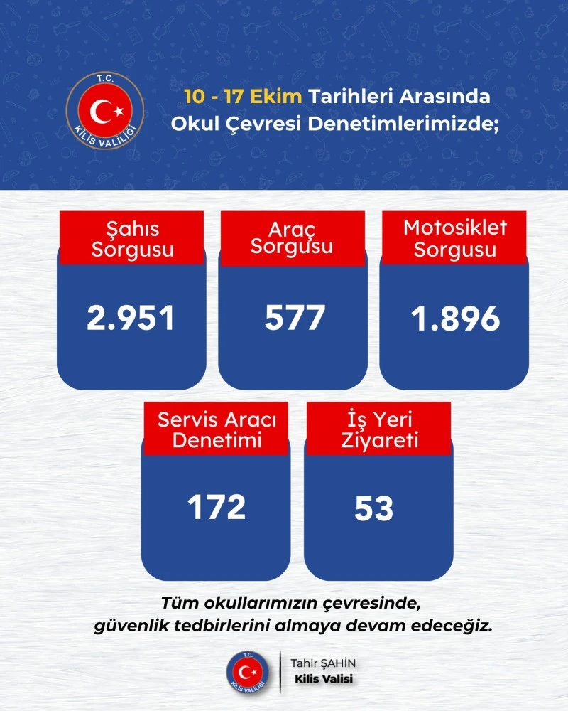 <h3>Kilis Valiliği koordinesinde, 10-17 Ekim tarihleri arasında okul çevrelerinde güvenliğin sağlanması amacıyla kapsamlı denetimler gerçekleştirildi.</h3> <div></div> <div>Öğrencilerin huzur ve güven içinde eğitimlerini sürdürebilmeleri için yürütülen çalışmalarda, şahıs ve araçlara yönelik binlerce sorgulama yapıldı.</div> <div>Yapılan denetimlerde:</div> <div>2.951 şahıs sorgulandı</div> <div>577 araç kontrol edildi</div> <div>1.896 motosiklet sorgulandı</div> <div>172 okul servisi denetlendi</div> <div>53 iş yeri ziyareti gerçekleştirildi</div> <div>Denetimlerin amacı, okul çevresindeki güvenliği artırmak, olası riskleri en aza indirmek ve öğrencilerin korunmasını sağlamaktı.</div> <div>Kilis Valisi Tahir Şahin, yapılan açıklamada, “Tüm okullarımızın çevresinde güvenlik tedbirlerini almaya devam edeceğiz,” ifadelerine yer verdi.</div> <div>Haber: İbrahim Güneş</div> <div></div> <div> </div> <div></div> <div> Kilis’te Nefes Kesen Kayıp Arama ve Kurtarma</div>