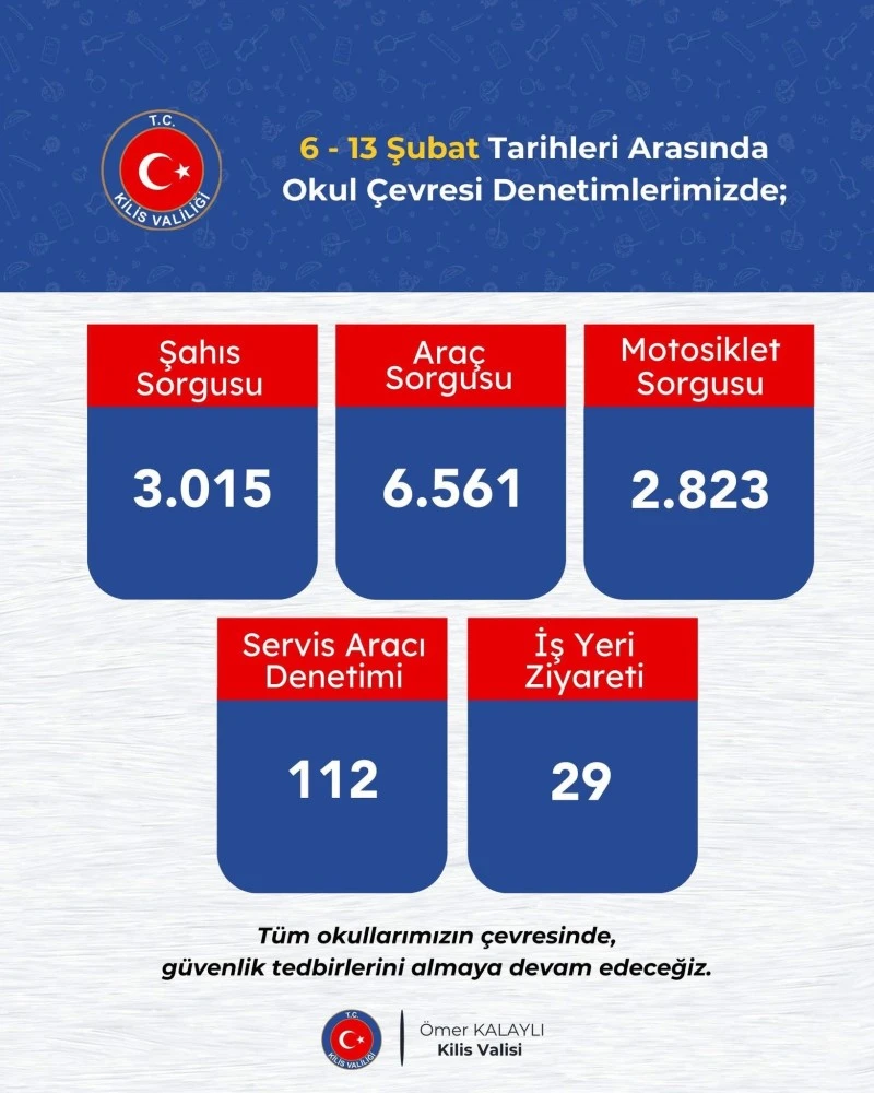 <div class="p1"><span class="s1"> Kilis Valiliği koordinesinde yürütülen uygulamalarda, öğrencilerin güvenliği için kapsamlı kontroller yapıldı.</span></div> <div class="p1"><span class="s1">Açıklanan verilere göre denetimler kapsamında:</span></div> <div class="p2"><span class="s2"><span class="Apple-tab-span"> </span>•<span class="Apple-tab-span"> </span>3 bin 15 şahıs sorgusu</span></div> <div class="p2"><span class="s2"><span class="Apple-tab-span"> </span>•<span class="Apple-tab-span"> </span>6 bin 561 araç sorgusu</span></div> <div class="p2"><span class="s2"><span class="Apple-tab-span"> </span>•<span class="Apple-tab-span"> </span>2 bin 823 motosiklet sorgusu</span></div> <div class="p2"><span class="s2"><span class="Apple-tab-span"> </span>•<span class="Apple-tab-span"> </span>112 servis aracı denetimi</span></div> <div class="p3"><span class="s3"><span class="Apple-tab-span"> </span>•<span class="Apple-tab-span"> </span>29 iş yeri ziyareti</span><span class="s1"> gerçekleştirildi.</span></div> <div class="p1"><span class="s1">Yetkililer, okul çevrelerinde güvenliğin sağlanması amacıyla uygulamaların aralıksız sürdürüleceğini belirtti. Özellikle servis araçları ve okul çevresindeki iş yerlerine yönelik denetimlerin titizlikle devam edeceği vurgulandı.</span></div> <div class="p1"><span class="s1">Kilis Valisi Ömer Kalaylı, tüm okulların çevresinde güvenlik tedbirlerinin alınmaya devam edileceğini ifade etti.</span></div> <div class="p1"><span class="s1">Öğrencilerin huzur ve güven ortamında eğitim alabilmesi için yapılan denetimlerin ilerleyen süreçte de süreceği bildirildi.</span></div> <div class="p1"><span class="s1">Haber: İbrahim Güneş </span></div> <div class="p1"><span class="s1"></span></div>