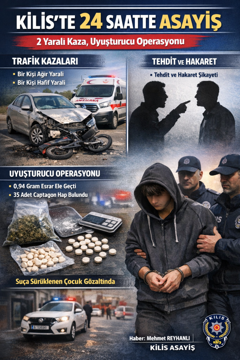 <h3 data-end="368" data-start="69">Kilis’te 30 Mart 2026 saat 08.00 ile 31 Mart 2026 saat 08.00 arasında polis sorumluluk bölgesinde meydana gelen olaylarda, iki ayrı trafik kazasında yaralananlar olurken, narkotik ekiplerinin çalışmasında uyuşturucu madde ele geçirildi. Ayrıca bir tehdit ve hakaret olayıyla ilgili işlem başlatıldı.</h3> <h3 data-end="409" data-start="370" data-section-id="16my1po">Trafik Kazalarında Yaralananlar Var</h3> <div data-end="770" data-start="411">Mehmet Abdi Bulut Mahallesi’nde saat 16.30 sıralarında meydana gelen kazada, otomobil ile elektrikli bisiklet çarpıştı. 1984 doğumlu A.A. yönetimindeki araç ile 1973 doğumlu A.C.’nin kullandığı elektrikli bisikletin çarpışması sonucu, bisiklette yolcu olarak bulunan 2007 doğumlu S.C. ağır şekilde yaralandı. Yaralının hayati tehlikesinin bulunduğu öğrenildi.</div> <div data-end="1035" data-start="772">Atatürk Mahallesi’nde saat 20.30’da meydana gelen bir başka kazada ise, 2000 doğumlu R.D.K. idaresindeki otomobil ile 1981 doğumlu E.Ç.’nin kullandığı motosiklet çarpıştı. Kazada motosiklet sürücüsü yaralandı. Yaralının hayati tehlikesinin bulunmadığı belirtildi.</div> <div data-end="1035" data-start="772"></div> <div data-end="1035" data-start="772"></div> <h3 data-end="1066" data-start="1037" data-section-id="1mawa3z">Tehdit ve Hakaret İddiası</h3> <div data-end="1295" data-start="1068">İsmet Paşa Mahallesi’nde saat 13.00 sıralarında yaşanan olayda, 1997 doğumlu H.Z. isimli şahıs, 1995 doğumlu A.C.’nin kendisini tehdit ettiğini ve hakarette bulunduğunu belirterek şikayetçi oldu. Olayla ilgili işlem başlatıldı.</div> <h3 data-end="1332" data-start="1297" data-section-id="19nt5jj">Narkotik Ekiplerinden Operasyon</h3> <div data-end="1594" data-start="1334">Oylum Mahallesi’nde saat 09.40’ta gerçekleştirilen uygulamada, durumundan şüphelenilerek durdurulan araçta bulunan 1991 doğumlu S.K.’nin üzerinde yapılan aramada 0,94 gram esrar ele geçirildi. Şahsın ikametinde yapılan aramada ise 35 adet captagon hap bulundu.</div> <div data-end="1737" data-start="1596">Olayla ilgili olarak TCK 191 kapsamında işlem başlatılırken, evde bulunan suça sürüklenen çocuk F.Z.K. Çocuk Şube Müdürlüğü’ne teslim edildi.</div> <h5 data-end="1784" data-start="1739">Haber: Mehmet REYHANLI<br data-end="1764" data-start="1761"></h5>