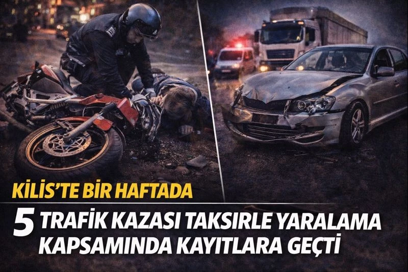 <h3 data-end="591" data-start="337">Kilis’te polis sorumluluk bölgesinde son bir haftada meydana gelen trafik kazalarının bilançosu açıklandı.</h3> <div data-end="591" data-start="337">Emniyet birimlerinin kayıtlarına göre, TCK kapsamında “taksirle yaralama” suçu kapsamında değerlendirilen toplam 5 trafik kazası meydana geldi.</div> <div data-end="911" data-start="593">Kazaların büyük bölümünde motosiklet sürücülerinin yer aldığı dikkat çekerken, otomobil, kamyonet ve tır gibi araçların karıştığı kazalarda çok sayıda kişi yaralandı. Olayların tamamında yaralıların hastaneye kaldırıldığı, bazı kazalarda ise yaralanmaların hayati tehlike oluşturacak düzeyde olduğu bildirildi.</div> <div data-end="1188" data-start="913">Atatürk Mahallesi’nde otomobil ile motosikletin çarpışması sonucu motosiklet sürücüsü yaralandı. Mehmet Abdi Bulut Mahallesi’nde tır ile otomobilin çarpıştığı kazada ise araçta bulunan iki kişi hayati tehlike arz edecek şekilde yaralandı ve tır sürücüsü gözaltına alındı.</div> <div data-end="1517" data-start="1190">24 Aralık tarihinde Kilis’te iki ayrı motosiklet kazası meydana geldi. Bir kazada iki motosikletin çarpışması sonucu yolcu ve sürücüler yaralanırken, diğer kazada suça sürüklenen çocuğun kullandığı motosikletin başka bir motosikletle çarpışması sonucu iki kişi yaralandı. Yaralanmaların hayati tehlike oluşturmadığı belirtildi.</div> <div data-end="1758" data-start="1519">Bir diğer kaza ise Yaşar Aktürk Mahallesi’nde meydana geldi. Kamyonet ile motosikletin çarpışması sonucu motosiklet sürücüsü yaralanırken, kamyonet sürücüsünün olay yerinden kaçtığı ve yakalanmasına yönelik çalışmaların sürdüğü bildirildi.</div> <div data-end="2006" data-start="1760">Yetkililer, kazaların büyük bölümünün dikkatsizlik ve trafik kurallarına uyulmaması nedeniyle meydana geldiğini belirterek, özellikle motosiklet sürücülerine koruyucu ekipman kullanımı ve hız kurallarına uyulması konusunda uyarılarda bulundu.</div> <h5 data-end="2082" data-start="2013">Haber: Abdurrahman REYHANLI<br data-end="2043" data-start="2040"></h5>