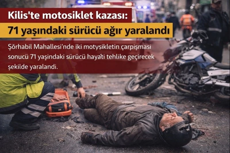 <h3 data-end="193" data-start="68"><strong data-end="193" data-start="68">Şörhabil Mahallesi’nde iki motosikletin çarpışması sonucu 71 yaşındaki sürücü hayati tehlike geçirecek şekilde yaralandı.</strong></h3> <div><strong data-end="193" data-start="68"></strong></div> <div data-end="270" data-start="195">Kilis’te meydana gelen trafik kazasında motosiklet sürücüsü ağır yaralandı.</div> <div data-end="464" data-start="272">Edinilen bilgilere göre, 15 Ocak 2026 günü saat 13.40 sıralarında Şörhabil Mahallesi’nde, 1954 doğumlu A.Ç. yönetimindeki motosiklet ile 2008 doğumlu M.E.P.’nin kullandığı motosiklet çarpıştı.</div> <div data-end="686" data-start="466">Çarpışmanın etkisiyle motosiklet sürücüsü A.Ç., hayati tehlike arz edecek şekilde yaralandı. İhbar üzerine olay yerine sağlık ekipleri sevk edildi. Yaralı sürücü, ilk müdahalenin ardından ambulansla hastaneye kaldırıldı.</div> <div data-end="752" data-start="688">Kazayla ilgili polis ekiplerinin inceleme başlattığı bildirildi.</div> <h5 data-end="811" data-start="754">Haber: Mehmet REYHANLI<br data-end="779" data-start="776"></h5>