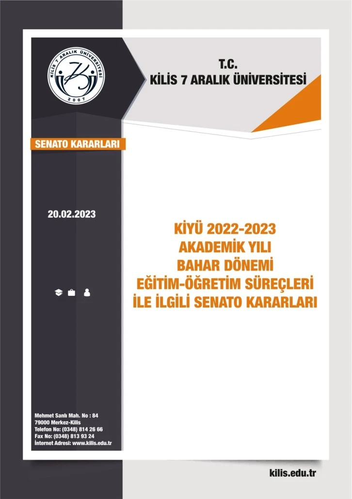 <div>KİYÜ Senato Kararlarını açıkladı</div> <div>Kilis</div> <div>Kilis 7 Aralık Üniversitesi yaşanan deprem sonrasında Senato kararlarını yaptığı toplantı sonrasında açıkladı.</div> <div>Bahar döneminde neler yapılacağı ile ilgili olarak öğürencilerine Senato kararlarını açıklayan Üniversite Yönetimi öğrencilerin neler yapacağını belirtti.</div> <div>İşte Senato kararları..</div> <div>Haber Merkezi</div> <div></div>