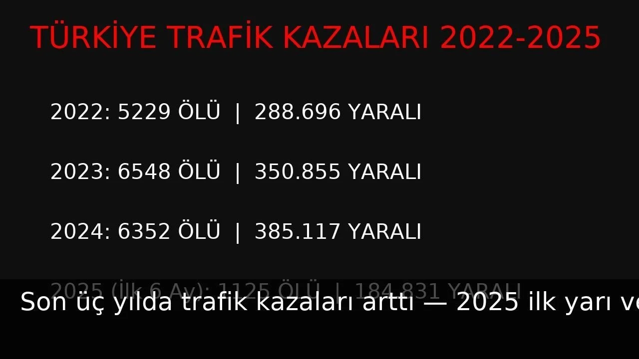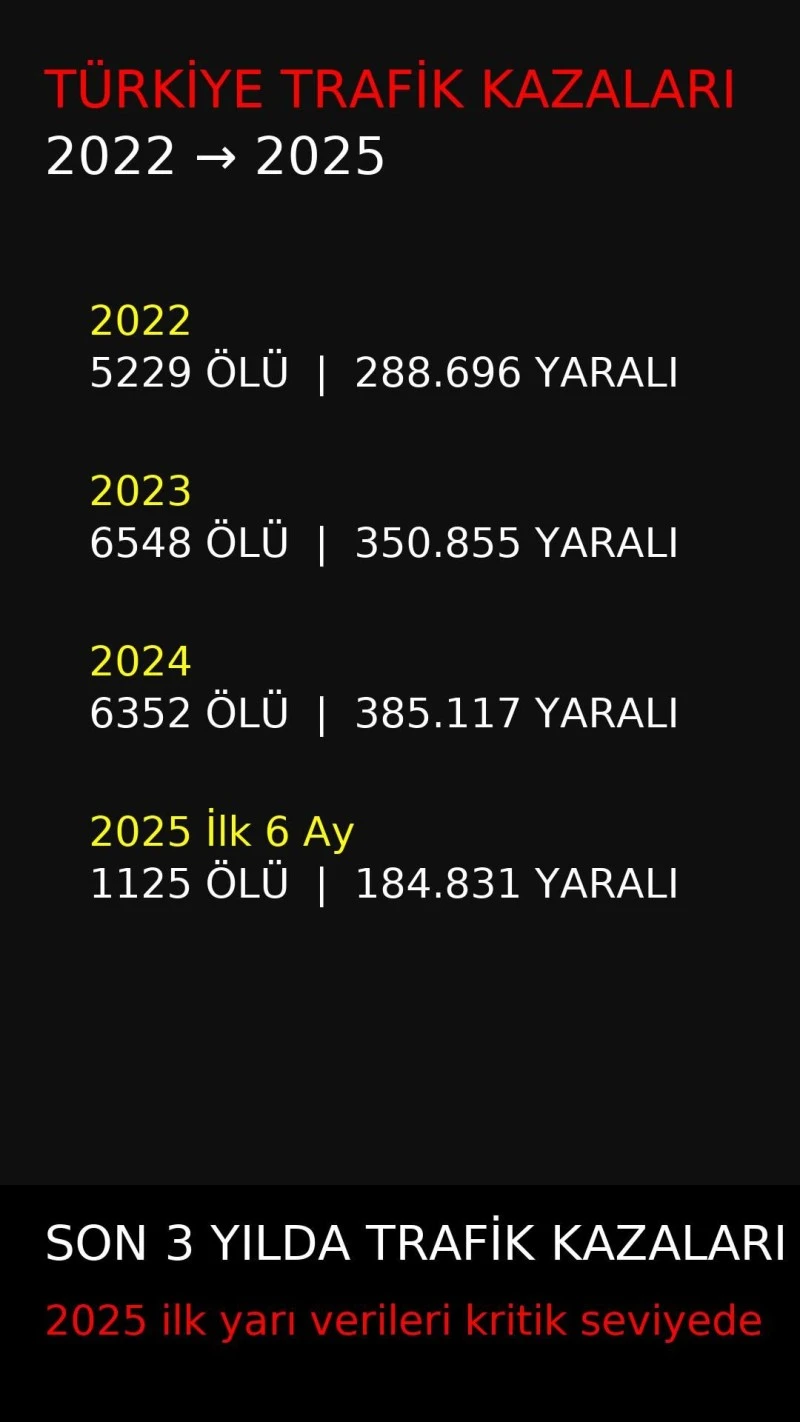 <h3 data-end="237" data-start="99"><span>Türkiye’de 2022-2024 döneminde trafik kazaları ve yaralı sayıları artarken, 2025’in ilk altı ayında da yüksek bilanço kayıtlara geçti</span></h3> <div><span></span></div> <div data-end="580" data-start="239">Türkiye İstatistik Kurumu (TÜİK) verileri ve Emniyet Genel Müdürlüğü istatistiklerine göre, son yıllarda karayollarında yaşanan trafik kazaları ve bu kazalarda yaralanan kişi sayısı belirgin şekilde arttı. 2022’de 197 bin 261 ölümlü/yaralanmalı trafik kazası kaydedildi. Aynı yıl 5 bin 229 kişi hayatını kaybetti, 288 bin 696 kişi yaralandı.</div> <div data-end="580" data-start="239"></div> <div data-end="831" data-start="582">Bir yıl sonra tablo daha ağırdı. 2023’te ölümlü ve yaralanmalı kaza sayısı 235 bin 71’e yükseldi. Bu kazalarda 6 bin 548 kişi öldü, 350 bin 855 kişi yaralandı. Yaralı sayısındaki artış devam ederken, kurban sayısı bir önceki yıla göre daha yüksekti.</div> <div data-end="1128" data-start="833">2024 yılında kaza sayısı 266 bin 855’e çıktı. Trafikte yaşamını yitirenlerin sayısı 6 bin 352 olarak kayda girdi. Yaralı sayısı 385 bin 117’ye ulaşarak son üç yılın en yüksek seviyesine çıktı. Aynı dönemde toplam kazalarda görülen artış, trafik güvenliğinin kamuoyunda tartışılmasına neden oldu.</div> <div data-end="1451" data-start="1130">2025 ise ilk altı aylık verilerle şimdiden dikkat çekti. Ocak–Haziran döneminde 130 bin 320 ölümlü ve yaralanmalı kaza meydana geldi. Bu kazalarda 1.125 kişi yaşamını yitirdi, 184 bin 831 kişi yaralandı. Yılın ikinci yarısındaki rakamlar bilinmese de, mevcut eğilim yıl sonu bilançosunun yüksek olabileceğine işaret etti.</div> <h5 data-end="1510" data-start="1453">Haber: Abdurrahman REYHANLI<br data-end="1483" data-start="1480"></h5>