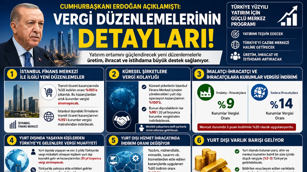 <h3 data-end="307" data-start="101"><strong data-end="307" data-start="101">Cumhurbaşkanı Recep Tayyip Erdoğan tarafından açıklanan yeni vergi düzenlemelerinin detayları netleşti. İş dünyasını ve yatırımcıyı doğrudan etkileyecek kritik adımlar devreye alınıyor.</strong></h3> <div data-end="652" data-start="309">Cumhurbaşkanı Erdoğan’ın duyurduğu “Türkiye Yüzyılı Yatırım İçin Güçlü Merkez Programı” kapsamında vergi sisteminde köklü değişiklikler yapılıyor. Yeni düzenlemeler, yatırım ortamını güçlendirmeyi hedeflerken özellikle üretim, ihracat ve uluslararası ticaret alanlarında dikkat çeken avantajlar getiriyor.</div> <h3 data-end="690" data-start="654" data-section-id="6cvz6q">Kurumlar Vergisinde Sert İndirim</h3> <div data-end="942" data-start="692">Yeni sistemle birlikte imalatçı ve ihracatçılar için kurumlar vergisi oranı yüzde 9’a kadar düşürülüyor. Sadece ihracat yapan firmalar için ise bu oran yüzde 14 olarak uygulanacak. Mevcut sistemde uygulanan oranlara göre ciddi bir indirim söz konusu.</div> <div data-end="1068" data-start="944">Bu adımın, üretimi artırması ve Türkiye’yi ihracat üssü haline getirmesi hedefleniyor.</div> <h3 data-end="1110" data-start="1070" data-section-id="1os23ua">Transit Ticarette Vergi Sıfırlanıyor</h3> <div data-end="1358" data-start="1112">İstanbul Finans Merkezi bünyesinde faaliyet gösteren şirketler için çok kritik bir düzenleme yapıldı. Buna göre transit ticaretten elde edilen kazançlarda uygulanan yüzde 50 vergi indirimi tamamen kaldırılarak yüzde 100’e çıkarıldı.</div> <div data-end="1576" data-start="1360">Bu değişiklikle birlikte transit ticaretten elde edilen kazançlar artık tamamen vergiden muaf olacak. İstanbul dışındaki firmalar için ise kazancın yüzde 95’i vergiden düşülecek.</div> <h3 data-end="1618" data-start="1578" data-section-id="1k9noy2">Küresel Şirketlere 20 Yıllık Avantaj</h3> <div data-end="1795" data-start="1620">Yeni düzenlemelerle küresel şirketlerin Türkiye’ye taşınması hedefleniyor. İstanbul Finans Merkezi’ni tercih eden şirketlere 20 yıl boyunca ciddi vergi avantajları sağlanacak.</div> <div data-end="2029" data-start="1797">Bu kapsamda, yurt dışı operasyonlardan elde edilen kazançların tamamı veya büyük kısmı kurumlar vergisinden muaf tutulacak. Ayrıca nitelikli çalışanlara yönelik gelir avantajları da getirilecek.</div> <h3 data-end="2074" data-start="2031" data-section-id="1tiocy9">Yurt Dışından Gelenlere Vergi Muafiyeti</h3> <div data-end="2289" data-start="2076">Yurt dışında yaşayan ve son 3 yılda Türkiye’de vergi mükellefi olmayan kişiler için önemli bir teşvik devreye giriyor. Bu kişiler Türkiye’ye geldiklerinde yurt dışı kazançları için 20 yıl boyunca vergi ödemeyecek.</div> <div data-end="2460" data-start="2291">Ama Türkiye içinde elde edilen gelirler vergilendirilmeye devam edecek. Ayrıca miras vergisi oranı da yüzde 1 seviyesine çekilecek.</div> <h3 data-end="2494" data-start="2462" data-section-id="4cupiq">Hizmet İhracatına Tam Destek</h3> <div data-end="2710" data-start="2496">Yazılım, mühendislik ve tasarım gibi alanlarda yurt dışına verilen hizmetlerden elde edilen gelirler için vergi indirimi yüzde 100’e çıkarılıyor. Bu da bu kazançların tamamen vergiden muaf olacağı anlamına geliyor.</div> <div data-end="2821" data-start="2712">Bu adımın özellikle teknoloji ve hizmet sektörünü büyütmesi bekleniyor.</div> <h3 data-end="2856" data-start="2823" data-section-id="1aw32ng">Varlık Barışı Yeniden Geliyor</h3> <div data-end="3051" data-start="2858">Yeni paketle birlikte bir kez daha “varlık barışı” uygulaması hayata geçirilecek. Yurt dışında bulunan para, altın ve menkul kıymetlerin düşük oranlı vergiyle Türkiye’ye getirilmesi sağlanacak.</div> <div data-end="3159" data-start="3053">Bu varlıkları beyan eden kişiler için vergi incelemesi yapılmayacak.</div> <h3 data-end="3188" data-start="3161" data-section-id="khkol2">Gözler Meclis Sürecinde</h3> <div data-end="3422" data-start="3190">Hazırlanan düzenlemelerin Türkiye Büyük Millet Meclisi’ne sunulması ve yasalaşma sürecinde yeni maddelerin eklenmesi bekleniyor. Ekonomide yeni dönemin kapısını aralayacak düzenlemeler, iş dünyası tarafından yakından takip ediliyor.</div> <h5 data-end="3498" data-start="3429">Haber: Mehmet REYHANLI<br data-end="3454" data-start="3451"></h5>