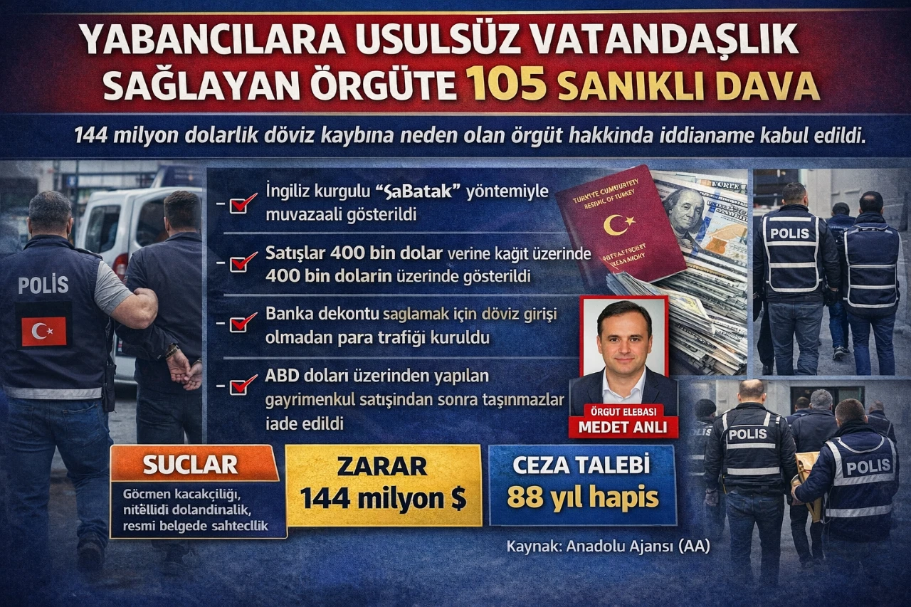 <h3 data-end="243" data-start="69"><strong data-end="243" data-start="69">İstanbul merkezli operasyonda gözaltına alınan şüpheliler hakkında hazırlanan iddianame kabul edildi. Örgütün 144 milyon dolarlık döviz kaybına neden olduğu iddia edildi.</strong></h3> <div data-end="513" data-start="245">İstanbul’da yabancı uyruklu kişilere usulsüz yöntemlerle Türk vatandaşlığı kazandırdığı öne sürülen organize suç örgütüne yönelik yürütülen soruşturma tamamlandı. Büyükçekmece Cumhuriyet Başsavcılığı tarafından hazırlanan iddianamede 105 kişi “sanık” olarak yer aldı.</div> <div data-end="658" data-start="515">İddianamede, Hazine ve Maliye Bakanlığı ile Tapu ve Kadastro Genel Müdürlüğü “suçtan zarar gören” kurumlar arasında gösterildi.</div> <h3 data-end="684" data-start="660">Eş zamanlı operasyon</h3> <div data-end="945" data-start="686">Soruşturma kapsamında 23 Eylül 2025’te İstanbul Göçmen Kaçakçılığıyla Mücadele Şube Müdürlüğü ekiplerince Türkiye genelinde eş zamanlı operasyon düzenlendi. Operasyonda örgüt elebaşı olduğu belirtilen Medet Anli’nin de aralarında bulunduğu çok sayıda şüpheli gözaltına alındı.</div> <h2 data-end="991" data-start="952">“Babatak” yöntemiyle muvazaalı satış</h2> <div data-end="1200" data-start="993">İddianamede, örgütün yabancılara vatandaşlık kazandırmak amacıyla muvazaalı gayrimenkul satışları gerçekleştirdiği belirtildi. Bu yönteme örgüt üyelerinin kendi aralarında “Babatak” adını verdiği kaydedildi.</div> <div data-end="1228" data-start="1202">Soruşturma dosyasına göre:</div> <div data-end="1342" data-start="1232">Gayrimenkuller gerçekte 50-70 bin dolar değerindeyken, resmi kayıtlarda 250 bin doların üzerinde gösterildi.</div> <div data-end="1488" data-start="1345">Yatırım yoluyla vatandaşlık şartının 400 bin dolara çıkarılmasının ardından satış bedelleri hayali olarak 400 bin doların üstünde gösterildi.</div> <div data-end="1585" data-start="1491">Döviz girişi sağlanmadan banka dekontu oluşturmak için para çekme-yatırma işlemleri yapıldı.</div> <div data-end="1695" data-start="1588">Satıştan sonra taşınmazların ilk sahibine iade edilmesini güvence altına alan taahhüt senetleri düzenlendi.</div> <div data-end="1825" data-start="1697">Bu yöntemle hem vatandaşlık şartının kağıt üzerinde sağlandığı hem de gerçekte Türkiye’ye döviz girişinin olmadığı iddia edildi.</div> <h2 data-end="1855" data-start="1832">MASAK raporu dosyada</h2> <div data-end="2141" data-start="1857">İddianamede, Mali Suçları Araştırma Kurulu (MASAK) raporuna da yer verildi. Raporda, banka dekontu oluşturmak amacıyla para trafiği sağlandığı, örgüt elebaşı Medet Anli ve şirketlerine ait 91 ayrı işlemde toplam 486 milyon 930 bin 946 liralık işlem hacmi bulunduğu belirtildi.</div> <div data-end="2346" data-start="2143">Para transferlerinin açıklama kısmında “elden teslim alınan altın bedeli” ve “hurda altın” ifadelerinin kullanıldığı, suçtan elde edilen gelirin altın alımı yoluyla aklanmaya çalışıldığı değerlendirildi.</div> <h2 data-end="2389" data-start="2353">144 milyon dolarlık kayıp iddiası</h2> <div data-end="2696" data-start="2391">İddianamede, örgütün eylemleri sonucunda 144 milyon 300 bin dolar döviz girişi ve manevi kayba neden olunduğu öne sürüldü. Toplam 459 ayrı eylemin yer aldığı dosyada, sanıkların “göçmen kaçakçılığı”, “nitelikli dolandırıcılık” ve “resmi belgede sahtecilik” suçlarını örgütlü şekilde işlediği iddia edildi.</div> <h2 data-end="2732" data-start="2703">88 yıla kadar hapis talebi</h2> <div data-end="2786" data-start="2734">Örgüt elebaşı olduğu belirtilen Medet Anli hakkında:</div> <div data-end="2816" data-start="2790">Nitelikli dolandırıcılık</div> <div data-end="2853" data-start="2819">Suç işlemek amacıyla örgüt kurma</div> <div data-end="2920" data-start="2856">Bir yabancıyı ülkeye sokma veya ülkede kalmasına imkan sağlama</div> <div data-end="3001" data-start="2922">suçlarından 22 yıl 4 ay 15 günden 88 yıl 9 aya kadar hapis cezası talep edildi.</div> <div data-end="3165" data-start="3003">Diğer sanıklar hakkında ise örgüt üyeliği, resmi belgede sahtecilik, nitelikli dolandırıcılık ve örgüte yardım suçlarından değişen oranlarda hapis cezası istendi.</div> <div data-end="3307" data-start="3167">Hazırlanan iddianame, Büyükçekmece Asliye Ceza Mahkemesi tarafından kabul edildi. 105 sanığın yargılanmasına önümüzdeki günlerde başlanacak.</div> <h5 data-end="3333" data-start="3309">Haber: Mehmet REYHANLI</h5> <h5 data-end="27" data-start="0">Kaynak: Anadolu Ajansı (AA)</h5>