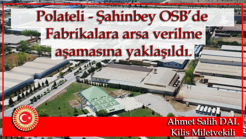 18 Mart 2013’te ilk başvurusu yapılan Kilis Polateli – Şahinbey OSB ile ilgili Bilgilendirme raporu, Yer Tespiti, Hazineye ait arazilerin ve Mera arazilerinin işlemleri, Jeolojik gözlem etüdü, ÇED raporu, Zemin Etüdü çalışmaları tamamlanmıştır. 4 Aralık 2020’de Alt yapı çizim ihalesi yapılmıştır. Şubat ayı içerisinde talep eden fabrikalara arsa verilmesi aşamasına gelinecektir. Alt yapı çalışmalarının çok yakın bir zamanda başlayacağı Polateli-Şahinbey OSB’de fabrika inşaatlarının başlaması için de bir engel kalmayacak ve alt yapı çalışmaları yapılırken fabrikalar da inşaatlarına başlayabilecektir.