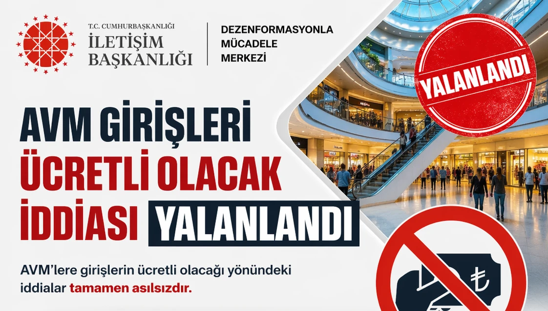 T.C. Cumhurbaşkanlığı İletişim Başkanlığı Dezenformasyonla Mücadele Merkezi, son günlerde sosyal medyada yayılan “alışveriş merkezlerine girişlerin ücretli olacağı” yönündeki iddialara ilişkin net bir açıklama yaptı. Yapılan açıklamada, söz konusu iddiaların tamamen asılsız olduğu belirtildi.