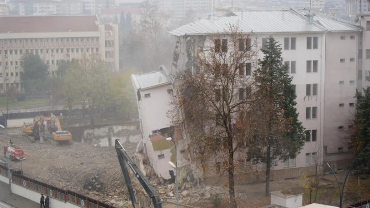"Asrın felaketi" olarak nitelenen depremde ağır hasar aldığı için boşaltılan binada yıkım çalışmaları devam ediyor. 3 iş makinesi ile sürdürülen yıkım çalışmalarının kısa sürede tamamlanması hedefleniyor.