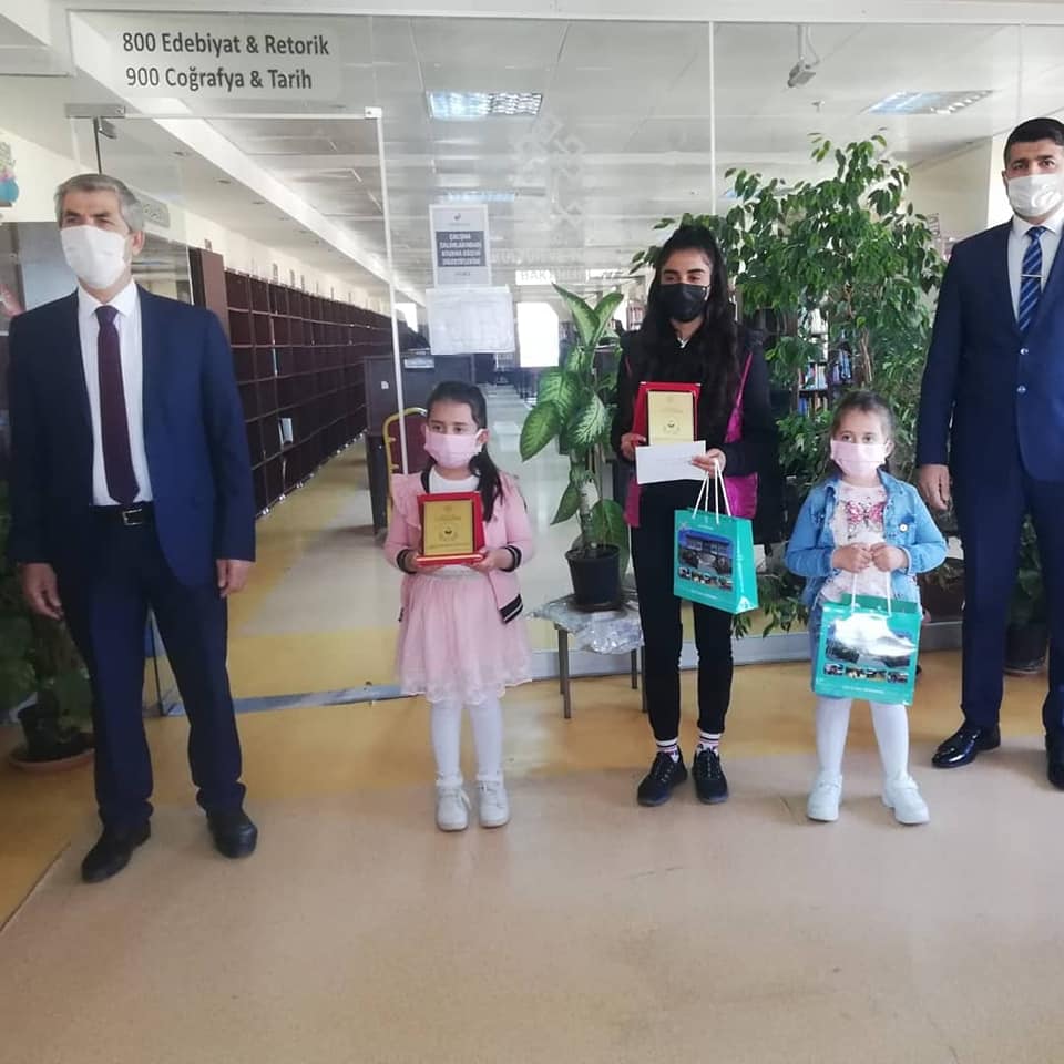 "57.Kütüphane Haftası dolayısıyla 2020 yılında en çok okuyan çocuk grubumuzda(Elif Züleyha ÇİFLİKLİ-128 Adet kitapla) genç - yetişkin grubumuzda(Birsen Nur BOZKIR-65 Adet kitapla) Hediye Çeki - Kitap Seti-Plaketten oluşan Hediye setlerini İl Kültür ve Turizm Müdür Vekilimiz ile İl Halk Kütüphanesi Müdürümüz takdim edip, başarılarının devamını dilediler." Haber Merkezi