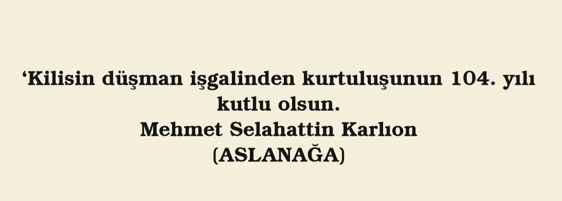 Kilisli iş insanı Mehmet Selahittin Karlıon, Kilis’in düşman işgalinden kurtuluşunun 104. yıl dönümü dolayısıyla bir kutlama mesajı yayımladı.