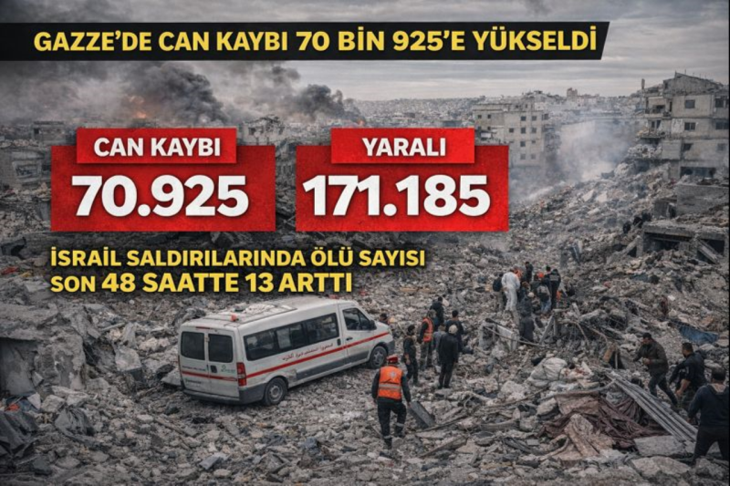 İsrail’in Gazze Şeridi’ne yönelik saldırılarında yaşamını yitirenlerin sayısı son 48 saatte 13 artarak 70 bin 925’e çıktı. Yaralı sayısı 171 bin 185 olarak kaydedildi.