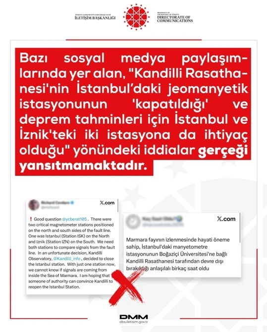 Dezenformasyonla Mücadele Merkezi (DMM), bazı sosyal medya paylaşımlarında yer alan “Kandilli Rasathanesi’nin İstanbul’daki jeomanyetik istasyonunun kapatıldığı” ve “deprem tahminleri için İstanbul ve İznik’te iki istasyona da ihtiyaç olduğu” yönündeki içeriklerin gerçeği yansıtmadığını açıkladı.