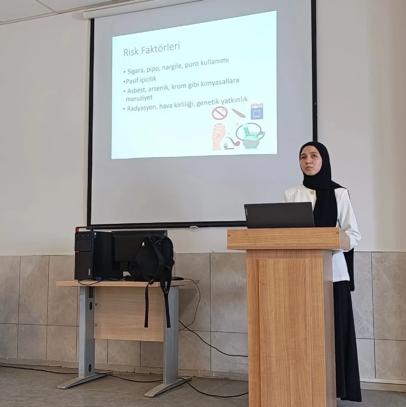 Eğitim, Kilis İl Sağlık Müdürlüğü’nde görev yapan Dr. Nadiye Hocaoğlu ve Hemşire Seda Demir tarafından gerçekleştirildi. Sunumlarda, akciğer kanserinin dünyada en sık görülen ve en fazla ölüme neden olan kanser türleri arasında yer aldığı vurgulandı. Sigara içmenin birincil risk faktörü olduğunun altı çizilirken; pasif içicilik, hava kirliliği, genetik yatkınlık ve mesleki maruziyet gibi diğer risk faktörleri üzerinde de duruldu.