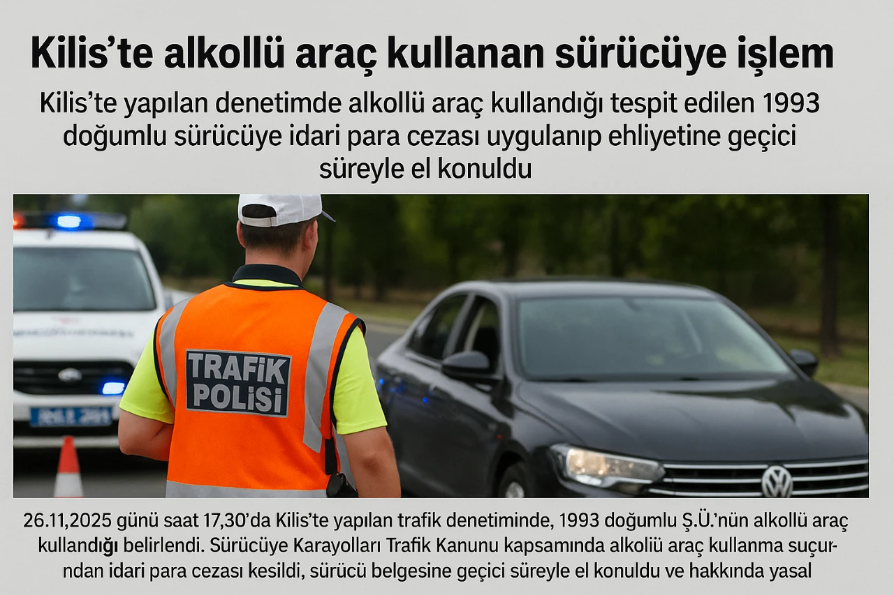26.11.2025 günü saat 17.30’da Kilis’te yapılan trafik denetiminde, 1993 doğumlu Ş.Ü.’nün alkollü araç kullandığı belirlendi. Sürücüye Karayolları Trafik Kanunu kapsamında alkollü araç kullanma suçundan idari para cezası kesildi, sürücü belgesine geçici süreyle el konuldu ve hakkında yasal işlem başlatıldı.