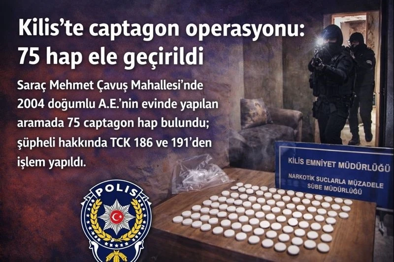 Edinilen bilgilere göre, 1 Şubat 2026 günü saat 22.15 sıralarında Saraç Mehmet Çavuş Mahallesi’nde, uyuşturucu madde sattığı yönünde beyan bulunan şüpheli 2004 doğumlu A.E.’nin ikametinde arama yapıldı. Aramada 75 adet captagon hap ele geçirildi.