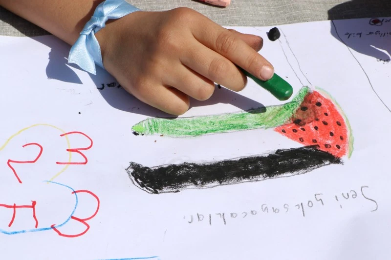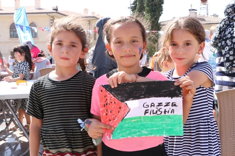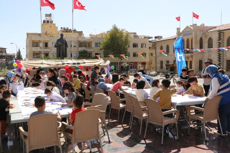 Kilis Sivil Dayanışma Platformu ve Yetim Vakfı işbirliğinde Cumhuriyet Meydanı'nda düzenlenen etkinliğe katılanlar, Filistinli çocuklarla ilgili hislerini rulo kağıtlara çizdi.