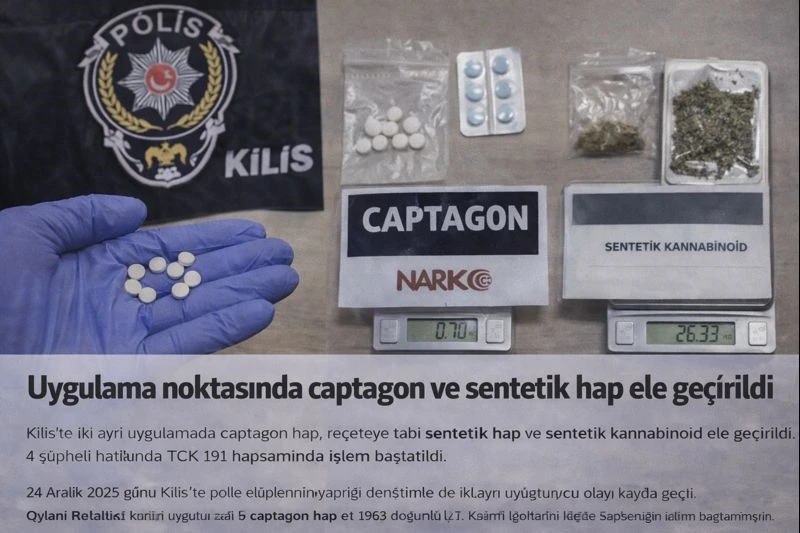 Kilis’te iki ayrı uygulamada captagon hap, reçeteye tabi sentetik hap ve sentetik kannabinoid ele geçirildi. 4 şüpheli hakkında TCK 191 kapsamında işlem başlatıldı.