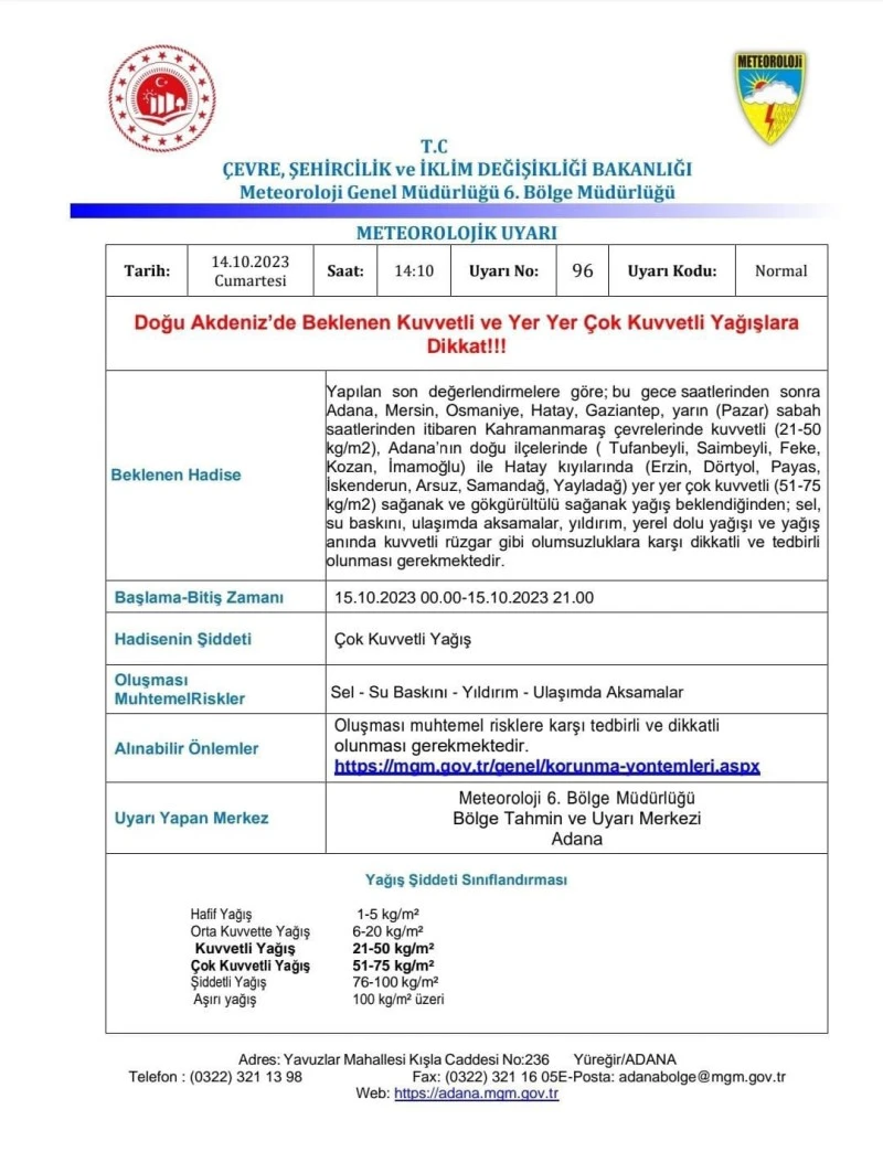 Meteorolojiden yapılan açıklamada, “Yapılan son değerlendirmelere göre; bu gece saatlerinden sonra Adana, Mersin, Osmaniye, Hatay, Gaziantep, yarın (Pazar) sabah saatlerinden itibaren Kahramanmaras çevrelerinde kuvvetli (21-50 kg/m2), Adana'nin dogu ilçelerinde (Tufanbeyli, Saimbeyli, Feke, Kozan, Imamoglu) ile Hatay kiyilarinda (Erzin, Dörtyol, Payas, Iskenderun, Arsuz, Samandag, Yayladag) yer yer çok kuvvetli (51-75 kg/m2) sağanak ve gökgürültülü sağanak yağış beklendiğinden; sel, su baskını, ulaşımda aksamalar, yıldırım, yerel dolu yağışı ve yapış anında kuvvetli rüzgar gibi olumsuzluklara karşı dikkatli ve tedbirli olunmasi gerekmektedir” denildi. Haber Merkezi