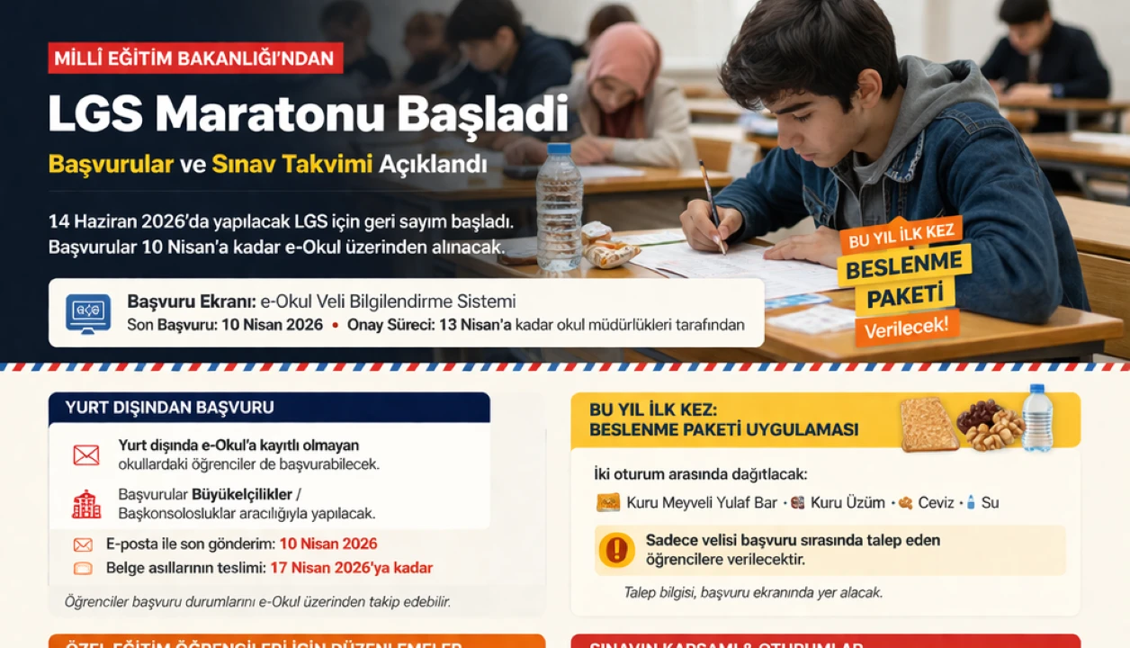 Milli Eğitim Bakanlığı, 2026 yılı Liselere Geçiş Sistemi (LGS) kapsamındaki merkezi sınav için başvuru ve uygulama kılavuzunu yayımladı. Sınava katılım isteğe bağlı olacak. Öğrenciler başvurularını 10 Nisan’a kadar e-Okul sistemi üzerinden gerçekleştirecek. Başvurular, okul müdürlükleri tarafından 13 Nisan’a kadar onaylanacak.