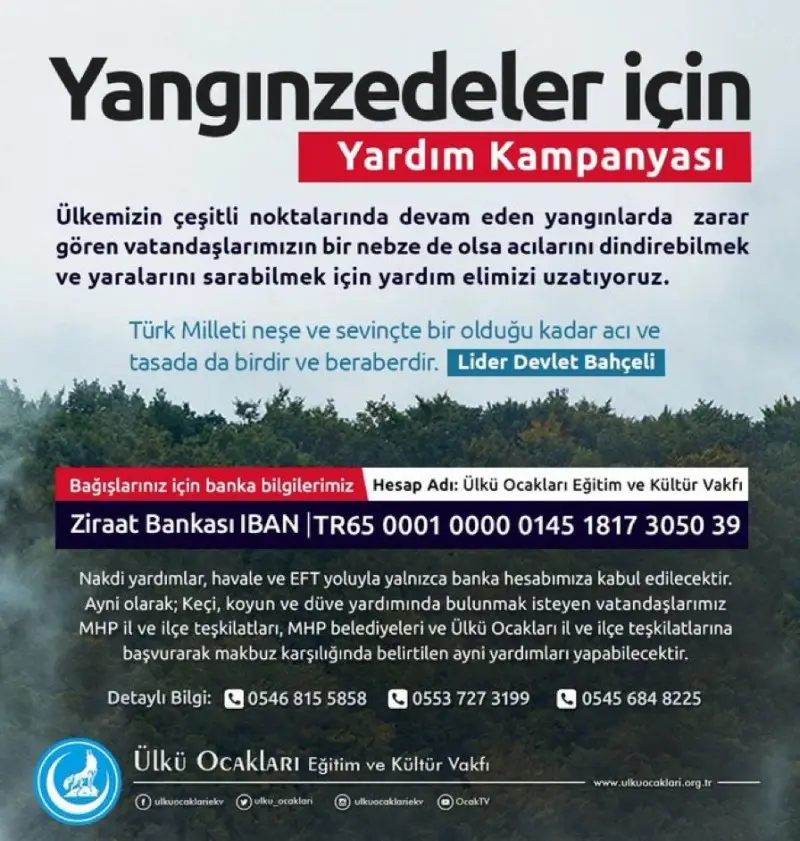 Milliyetçi Hareket Partisi Genel merkezinin almış olduğu karar sonrasında yangında zarar gören Yangınzedeler için yardım kampanyasının başlatıldığı duyuruldu.