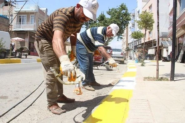 Kış ayında ve güneşin etkili olduğu bugünlerde şehrin muhtelif yerlerinde bulunan refüjlerdeki ve kaldırımdaki dikeç taşların renklerinin gitmesi üzerine yeniden boyanmaya başlandı.
