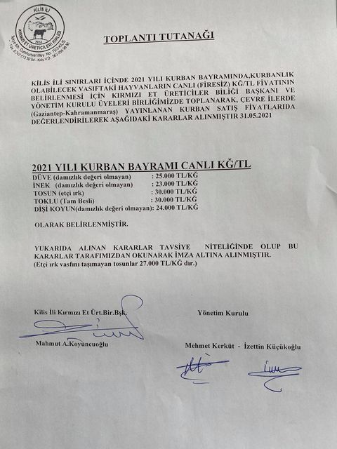 Kilis Kırımızı Et Üreticileri Birliğinin yapmış olduğu toplantının ardından aldığı karara göre Kilis'te;